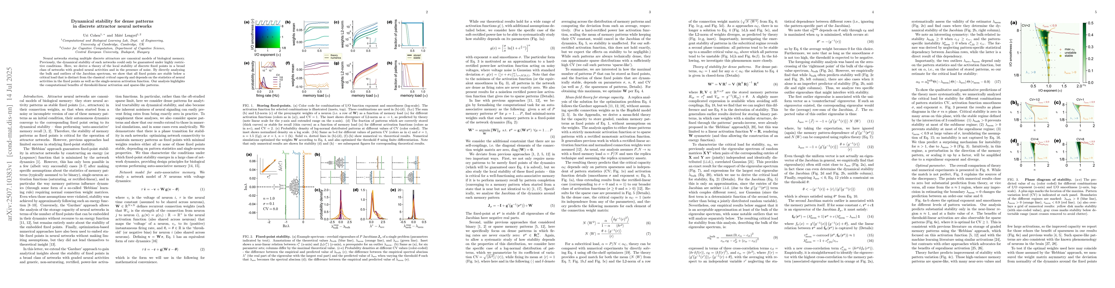 Neural networks storing multiple discrete attractors are canonical models of biological memory. Previously, the dynamical stability of such networks could only be guaranteed under highly restrictive conditions. Here, we derive a theory of the local stability of discrete fixed points in a broad class of networks with graded neural activities and in the presence of noise. By directly analyzing the bulk and outliers of the Jacobian spectrum, we show that all fixed points are stable below a critical load that is distinct from the classical \textit{critical capacity} and depends on the statistics of neural activities in the fixed points as well as the single-neuron activation function. Our analysis highlights the computational benefits of threshold-linear activation and sparse-like patterns.