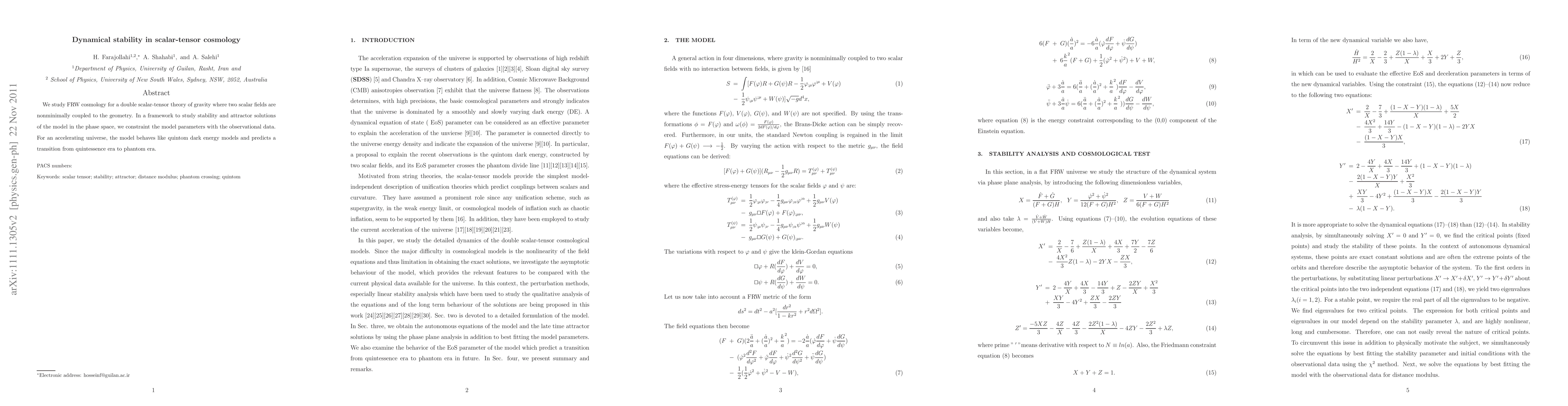 This paper investigates the dynamical stability of a double scalar-tensor theory of gravity in FRW cosmology, focusing on nonminimally coupled scalar fields. It constrains model parameters using observational data and predicts a transition from quintessence to phantom dark energy, akin to quintom models.
