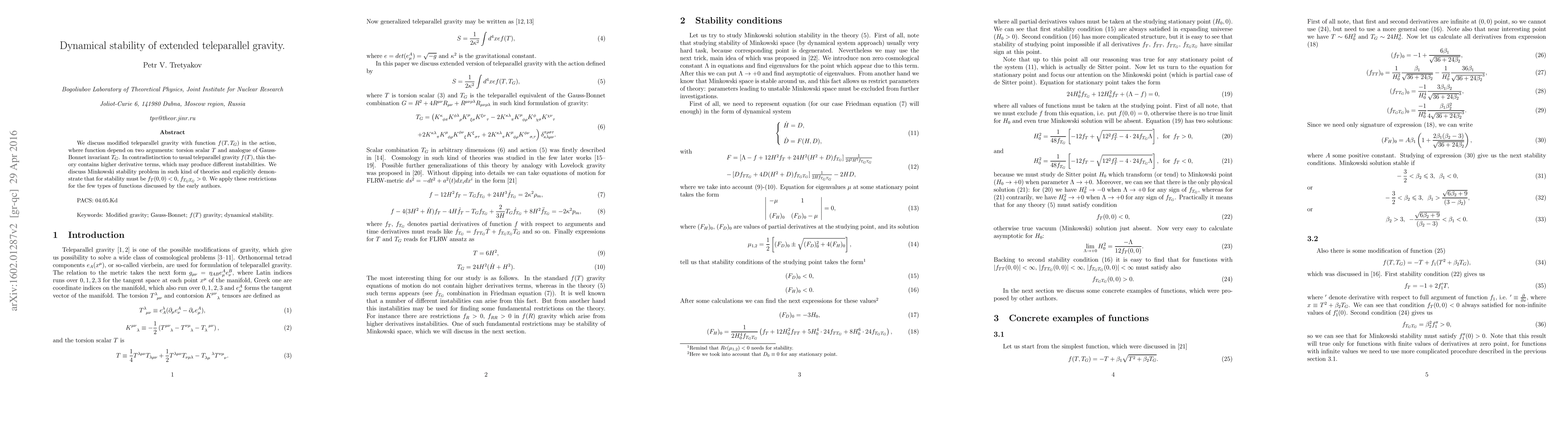 This paper explores the dynamical stability of extended teleparallel gravity with a modified action dependent on both the torsion scalar $T$ and the Gauss-Bonnet analogue $T_G$. It finds that for stability, the conditions $f_T(0,0)<0$ and $f_{T_GT_G}>0$ must be satisfied.