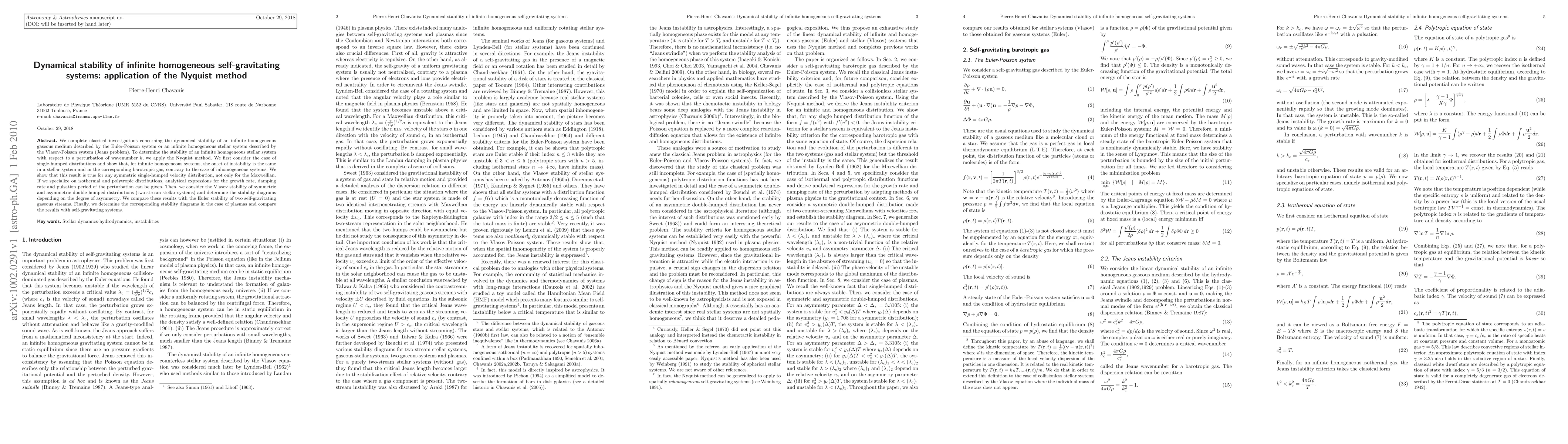 This paper investigates the dynamical stability of infinite homogeneous self-gravitating systems using the Nyquist method, showing that the onset of instability is the same for stellar systems and corresponding gaseous media. It also explores the stability of double-humped distributions and compares the results with gaseous and plasma systems.