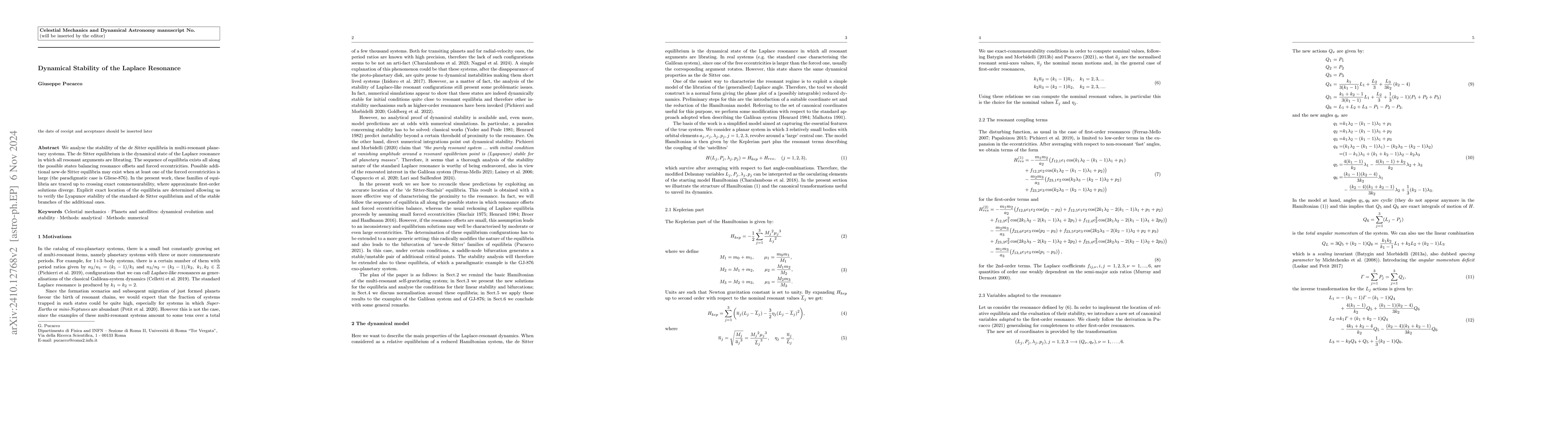 This paper analyzes the dynamical stability of de Sitter equilibria in multi-resonant planetary systems, focusing on the Laplace resonance where resonant arguments librate. It determines the exact locations of these equilibria and verifies the Lyapunov stability of both standard and additional equilibria, especially when large eccentricities are present.