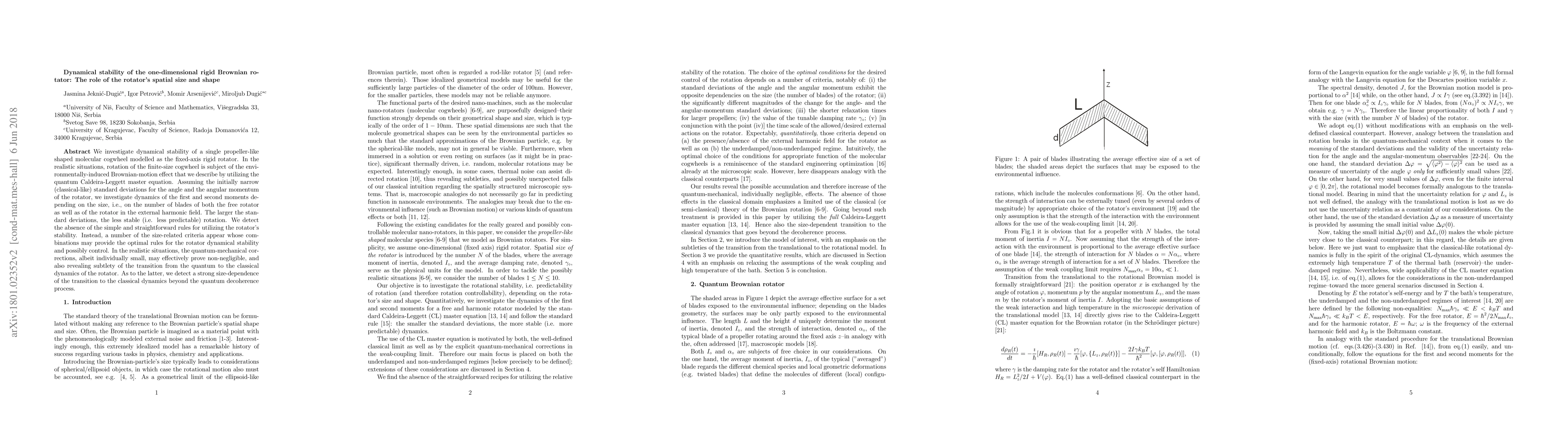 We investigate dynamical stability of a single propeller-like shaped molecular cogwheel modelled as the fixed-axis rigid rotator. In the realistic situations, rotation of the finite-size cogwheel is subject of the envi- ronmentally-induced Brownian-motion effect that we describe by utilizing the quantum Caldeira-Leggett master equation, in the weak-coupling limit. Assuming the initially narrow (classical-like) standard deviations for the an- gle and the angular momentum of the rotator, we investigate dynamics of the first and second moments depending on the size, i.e., on the number of blades of both the free rotator as well as of the rotator in the external har- monic field. The larger the standard deviations, the less stable (i.e. less pre- dictable) rotation. We detect the absence of the simple and straightforward rules for utilizing the rotator's stability. Instead, a number of the size-related criteria appear whose combinations may provide the optimal rules for the ro- tator dynamical stability and possibly control. In the realistic situations, the quantum-mechanical corrections, albeit individually small, may effectively prove non-negligible, and also revealing subtlety of the transition from the quantum to the classical dynamics of the rotator. As to the latter, we detect a strong size-dependence of the transition to the classical dynamics beyond the quantum decoherence process.