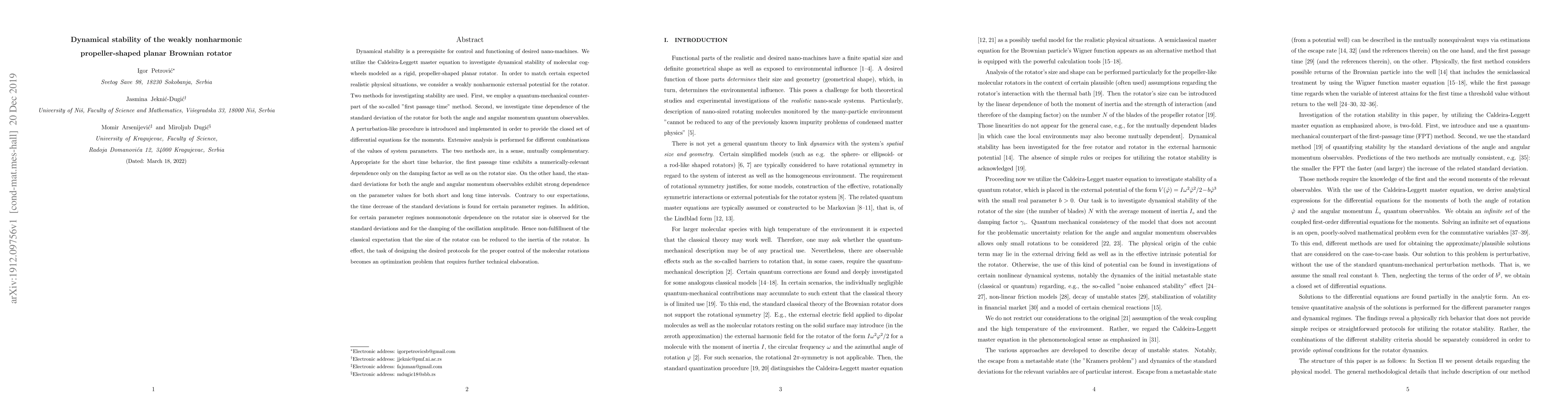 Dynamical stability is a prerequisite for control and functioning of desired nano-machines. We utilize the Caldeira-Leggett master equation to investigate dynamical stability of molecular cogwheels modeled as a rigid, propeller-shaped planar rotator. In order to match certain expected realistic physical situations, we consider a weakly nonharmonic external potential for the rotator. Two methods for investigating stability are used. First, we employ a quantum-mechanical counterpart of the so-called "First passage time" method. Second, we investigate time dependence of the standard deviation of the rotator for both the angle and angular momentum quantum observables. A perturbation-like procedure is introduced and implemented in order to provide the closed set of differential equations for the moments. Extensive analysis is performed for different combinations of the values of system parameters. The two methods are, in a sense, mutually complementary. Appropriate for the short time behavior, the First passage time exhibits a numerically-relevant dependence only on the damping factor as well as on the rotator size. On the other hand, the standard deviations for both the angle and angular momentum observables exhibit strong dependence on the parameter values for both short and long time intervals. Contrary to our expectations, the time decrease of the standard deviations is found for certain parameter regimes. In addition, for certain parameter regimes nonmonotonic dependence on the rotator size is observed for the standard deviations and for the damping of the oscillation amplitude.