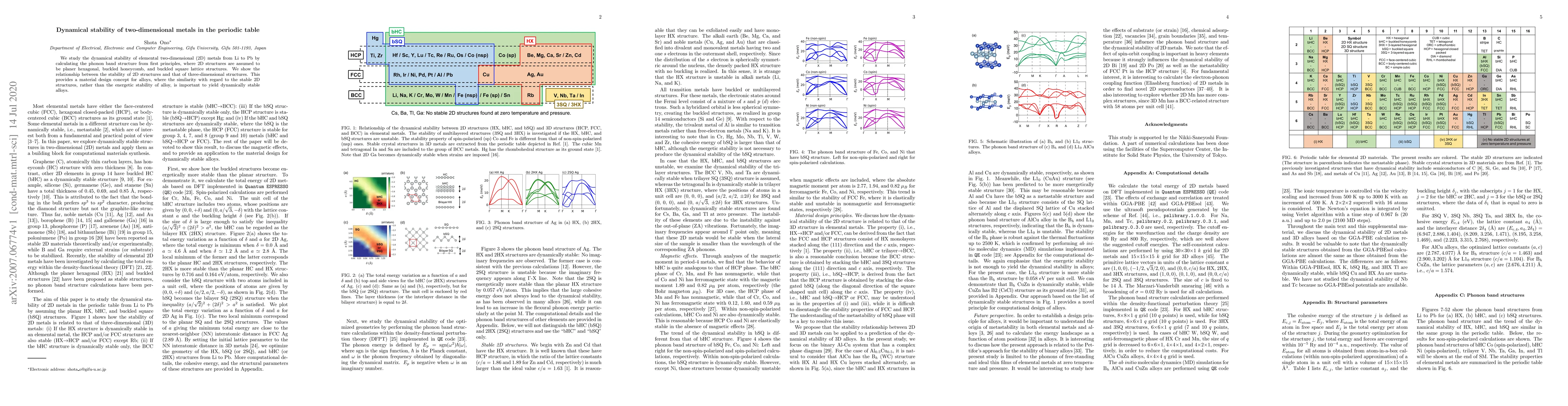 We study the dynamical stability of elemental two-dimensional (2D) metals from Li to Pb by calculating the phonon band structure from first principles, where 2D structures are assumed to be planer hexagonal, buckled honeycomb, and buckled square lattice structures. We show the relationship between the stability of 2D structures and that of three-dimensional structures. This provides a material design concept for alloys, where the similarity with regard to the stable 2D structures, rather than the energetic stability of alloy, is important to yield dynamically stable alloys.