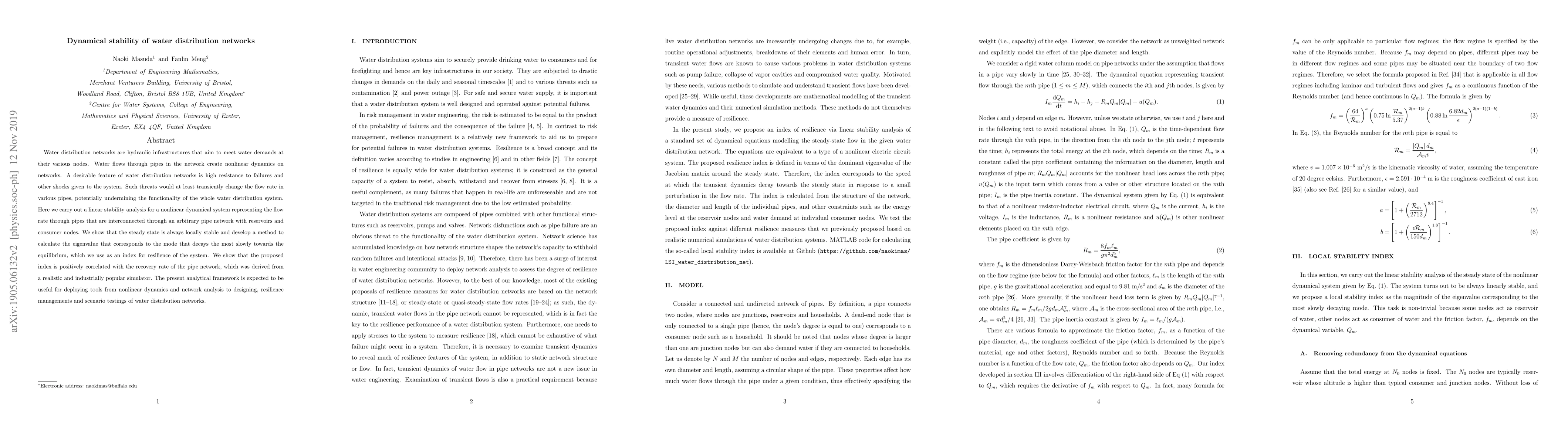 A study analyzes the stability of water distribution networks, finding that they tend to return to their equilibrium state after disturbances, with a method to assess resilience.