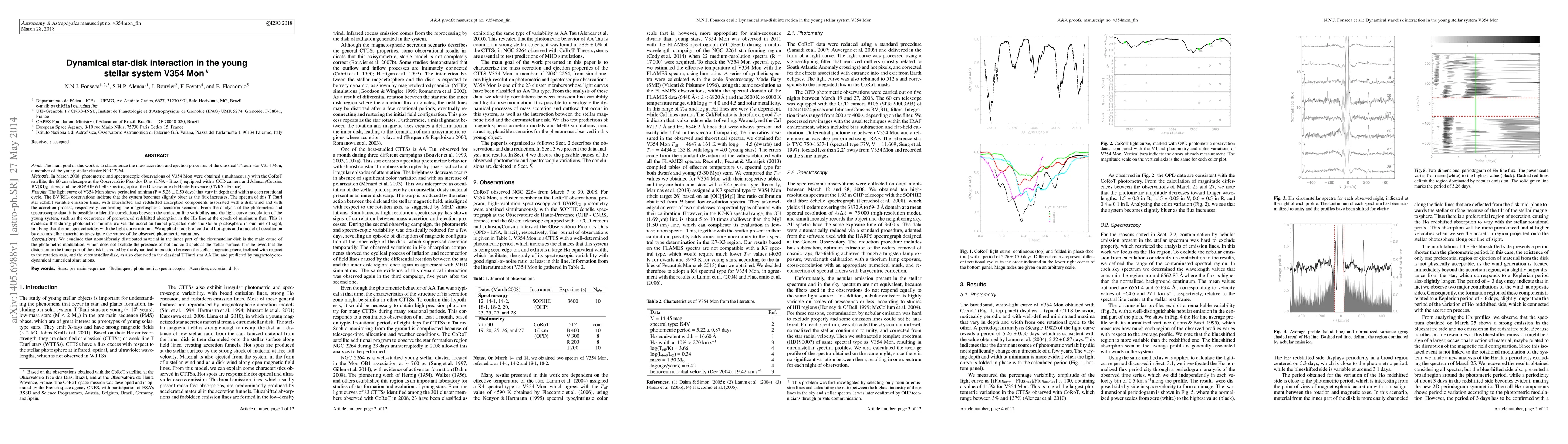 The main goal of this work is to characterize the mass accretion and ejection processes of the classical T Tauri star V354 Mon, a member of the young stellar cluster NGC 2264. In March 2008, photometric and spectroscopic observations of V354 Mon were obtained simultaneously with the CoRoT satellite, the 60 cm telescope at the Observat\'orio Pico dos Dias (LNA - Brazil) equipped with a CCD camera and Johnson/Cousins BVRI filters, and the SOPHIE \'echelle spectrograph at the Observatoire de Haute-Provence (CNRS - France). The light curve of V354 Mon shows periodical minima (P = 5.26 +/- 0.50 days) that vary in depth and width at each rotational cycle. From the analysis of the photometric and spectroscopic data, it is possible to identify correlations between the emission line variability and the light-curve modulation of the young system, such as the occurrence of pronounced redshifted absorption in the H_alpha line at the epoch of minimum flux. This is evidence that during photometric minima we see the accretion funnel projected onto the stellar photosphere in our line of sight, implying that the hot spot coincides with the light-curve minima. We applied models of cold and hot spots and a model of occultation by circumstellar material to investigate the source of the observed photometric variations. We conclude that nonuniformly distributed material in the inner part of the circumstellar disk is the main cause of the photometric modulation, which does not exclude the presence of hot and cold spots at the stellar surface. It is believed that the distortion in the inner part of the disk is created by the dynamical interaction between the stellar magnetosphere, inclined with respect to the rotation axis, and the circumstellar disk, as also observed in the classical T Tauri star AA Tau and predicted by magnetohydrodynamical numerical simulations.
