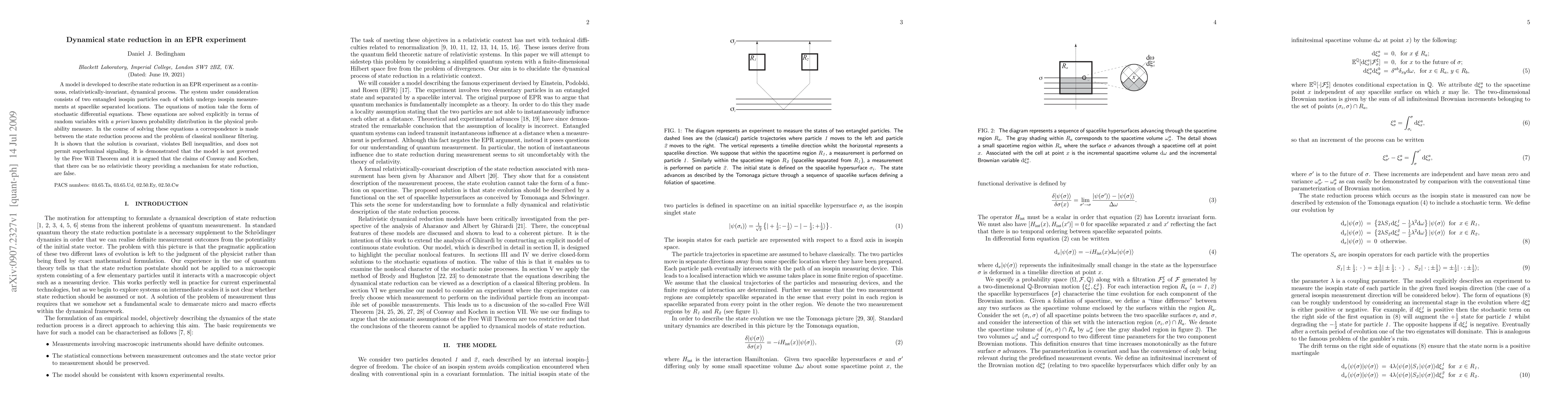 A model is developed to describe state reduction in an EPR experiment as a continuous, relativistically-invariant, dynamical process. The system under consideration consists of two entangled isospin particles each of which undergo isospin measurements at spacelike separated locations. The equations of motion take the form of stochastic differential equations. These equations are solved explicitly in terms of random variables with a priori known probability distribution in the physical probability measure. In the course of solving these equations a correspondence is made between the state reduction process and the problem of classical nonlinear filtering. It is shown that the solution is covariant, violates Bell inequalities, and does not permit superluminal signaling. It is demonstrated that the model is not governed by the Free Will Theorem and it is argued that the claims of Conway and Kochen, that there can be no relativistic theory providing a mechanism for state reduction, are false.