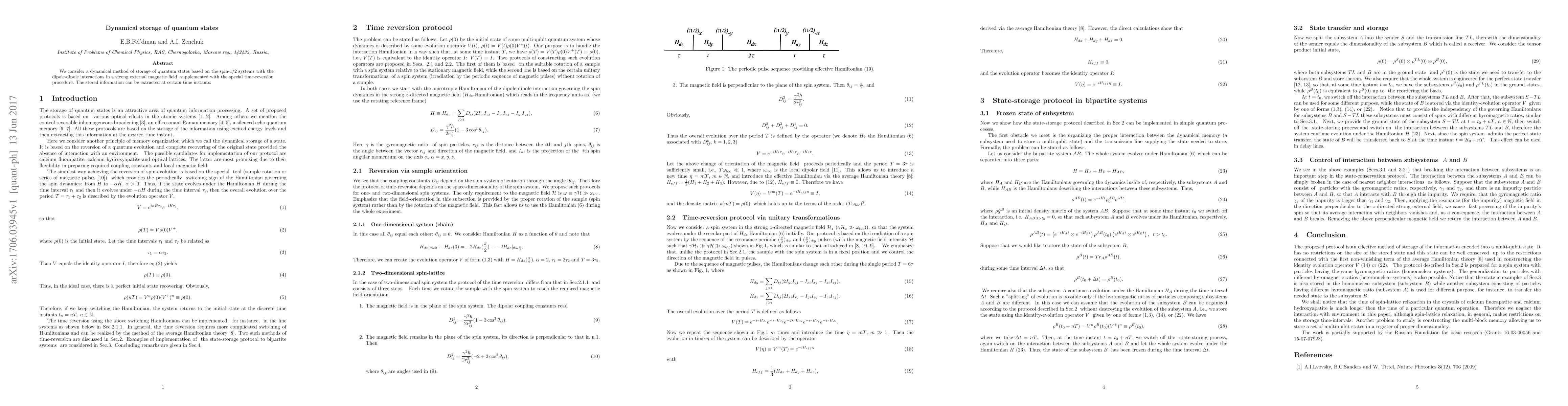 Summary: This paper explores a method for dynamically storing quantum states using spin-1/2 systems with dipole-dipole interactions in a strong magnetic field, enhanced by a time-reversion procedure, allowing retrieval of stored information at specific times.