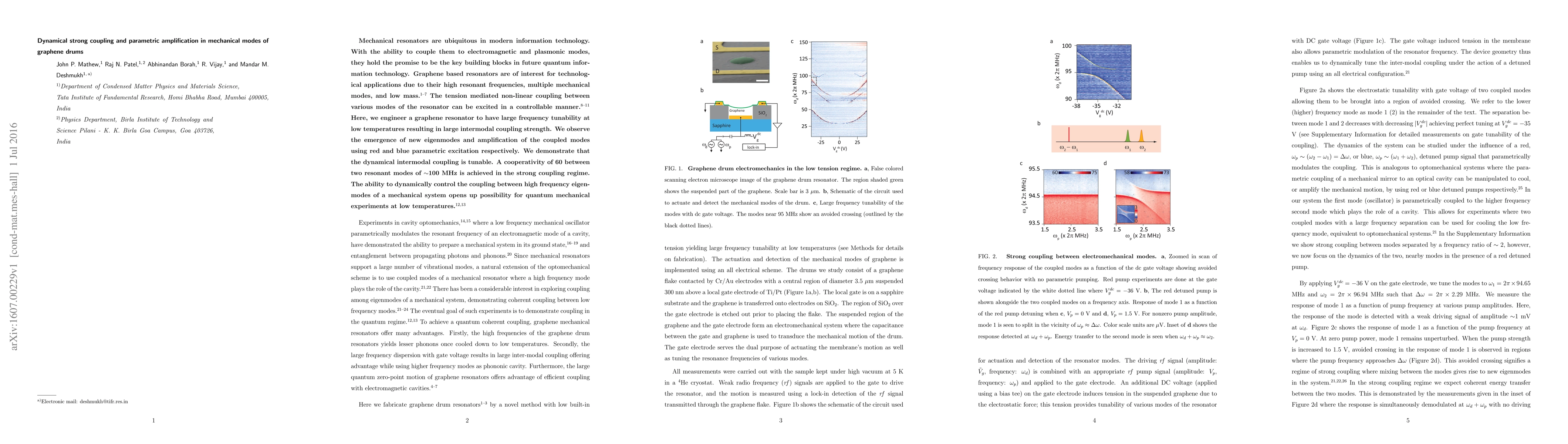 This paper investigates the strong coupling and parametric amplification in graphene mechanical resonators, achieving large frequency tunability and tunable intermodal coupling strength. The study demonstrates the emergence of new eigenmodes and amplification via red and blue parametric excitation, achieving a cooperativity of 60 between resonant modes, which facilitates potential quantum mechanical experiments.