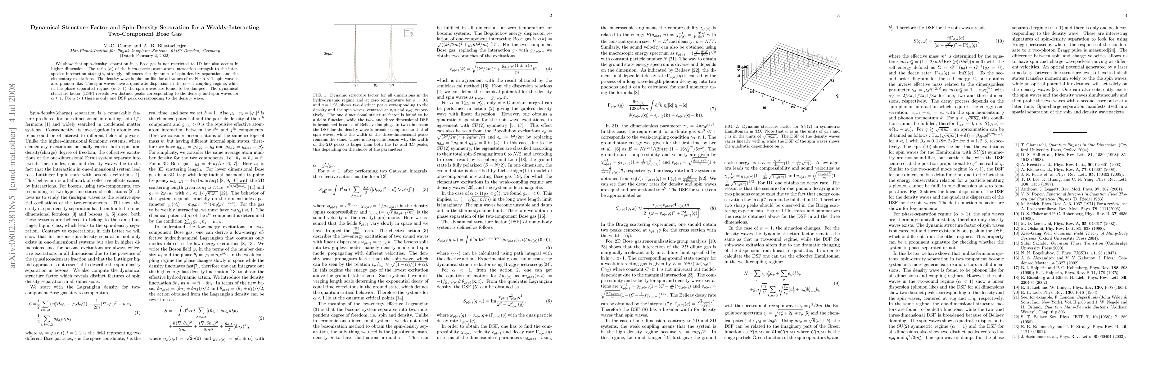 We show that spin-density separation in a Bose gas is not restricted to 1D but also occurs in higher dimension. The ratio ($\alpha$) of the intra-species atom-atom interaction strength to the inter-species interaction strength, strongly influences the dynamics of spin-density separation and the elementary excitations. The density wave is phonon-like for all values of $\alpha$. For $\alpha<1$, spin wave is also phonon-like. The spin waves have a quadratic dispersion in the $\alpha=1$ coupling regime, while in the phase separated regime ($\alpha>1$) the spin waves are found to be damped. The dynamical structure factor (DSF) reveals two distinct peaks corresponding to the density and spin waves for $\alpha \le 1$. For $\alpha > 1$ there is only one DSF peak corresponding to the density wave.