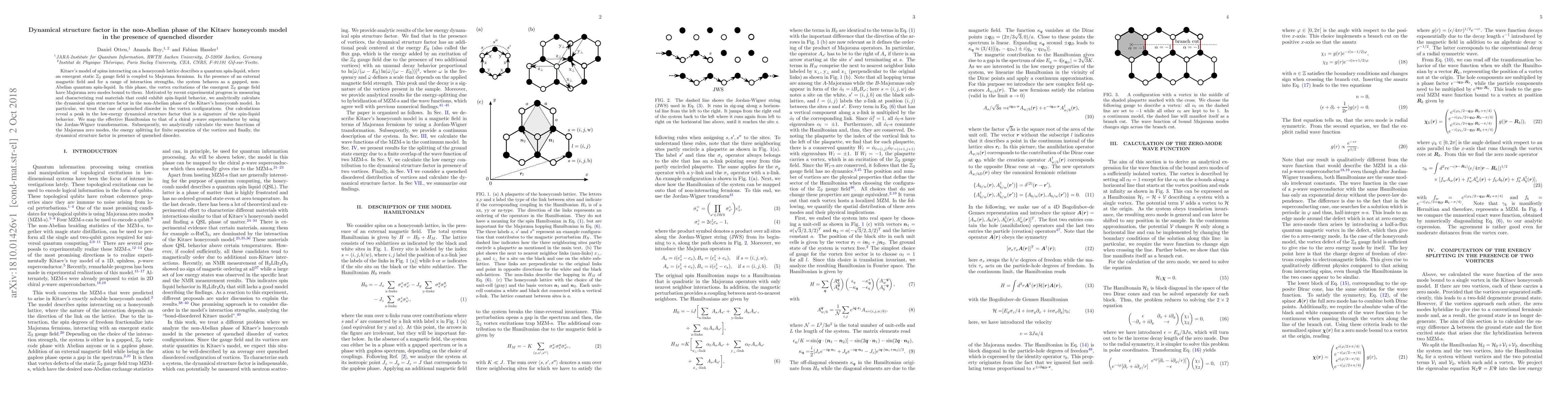 This paper analytically calculates the dynamical spin structure factor in the non-Abelian phase of Kitaev's honeycomb model, focusing on the effects of quenched disorder. It reveals a low-energy peak indicative of spin-liquid behavior and maps the effective Hamiltonian to a chiral p-wave superconductor, providing insights into Majorana zero modes and vortex dynamics.