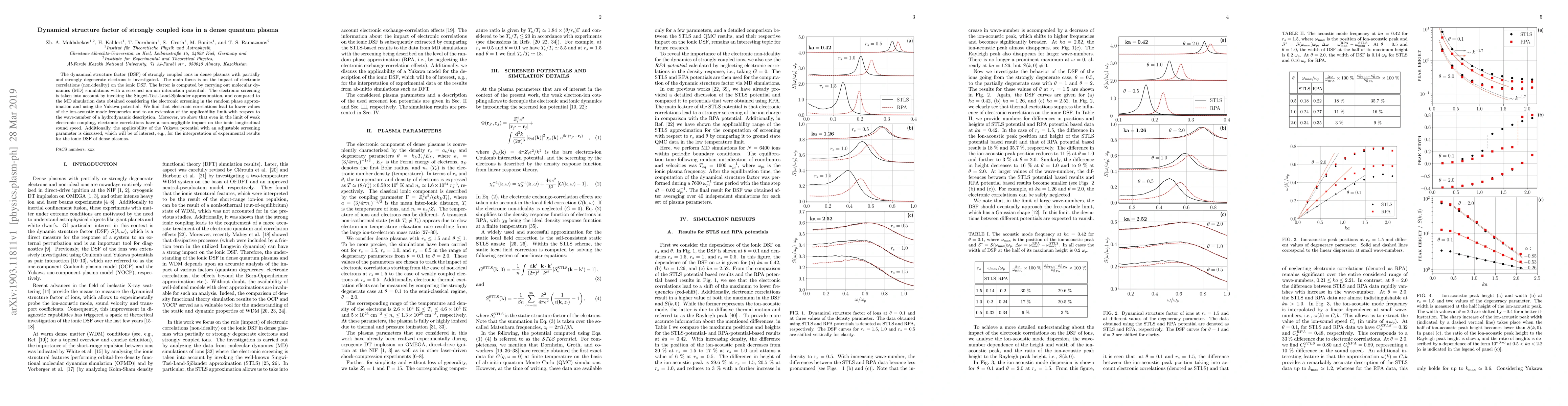 This paper investigates the dynamical structure factor (DSF) of strongly coupled ions in dense plasmas, focusing on the effects of electronic correlations on the ionic DSF. The study employs molecular dynamics simulations and compares results from different electronic screening models, revealing that electronic correlations significantly affect ion-acoustic mode frequencies and the applicability of hydrodynamic descriptions.