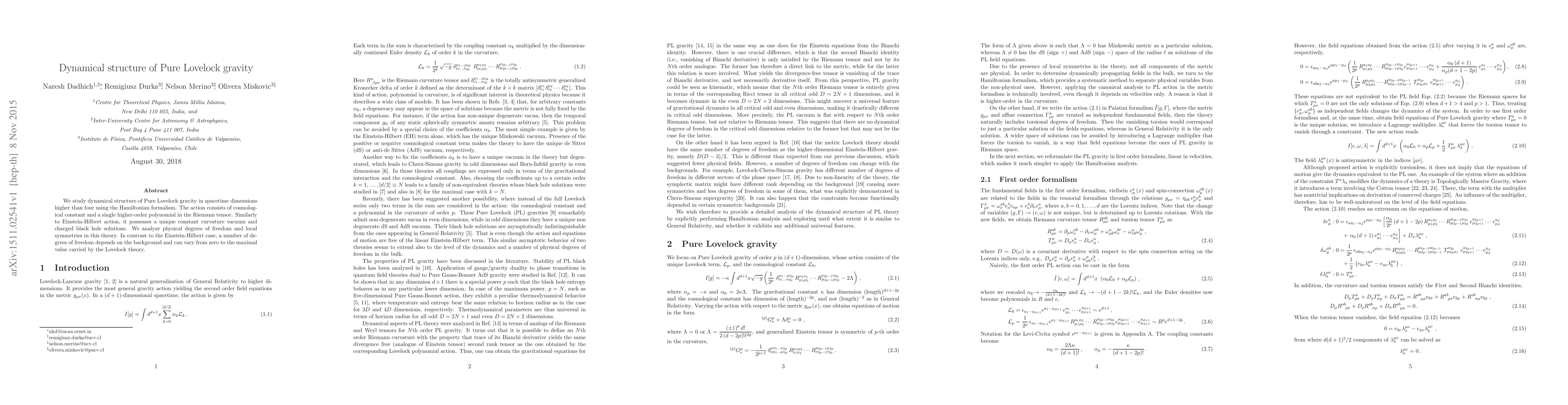 We study dynamical structure of Pure Lovelock gravity in spacetime dimensions higher than four using the Hamiltonian formalism. The action consists of cosmological constant and a single higher-order polynomial in the Riemann tensor. Similarly to Einstein-Hilbert action, it possesses a unique constant curvature vacuum and charged black hole solutions. We analyze physical degrees of freedom and local symmetries in this theory. In contrast to the Einstein-Hilbert case, a number of degrees of freedom depends on the background and can vary from zero to the maximal value carried by the Lovelock theory.