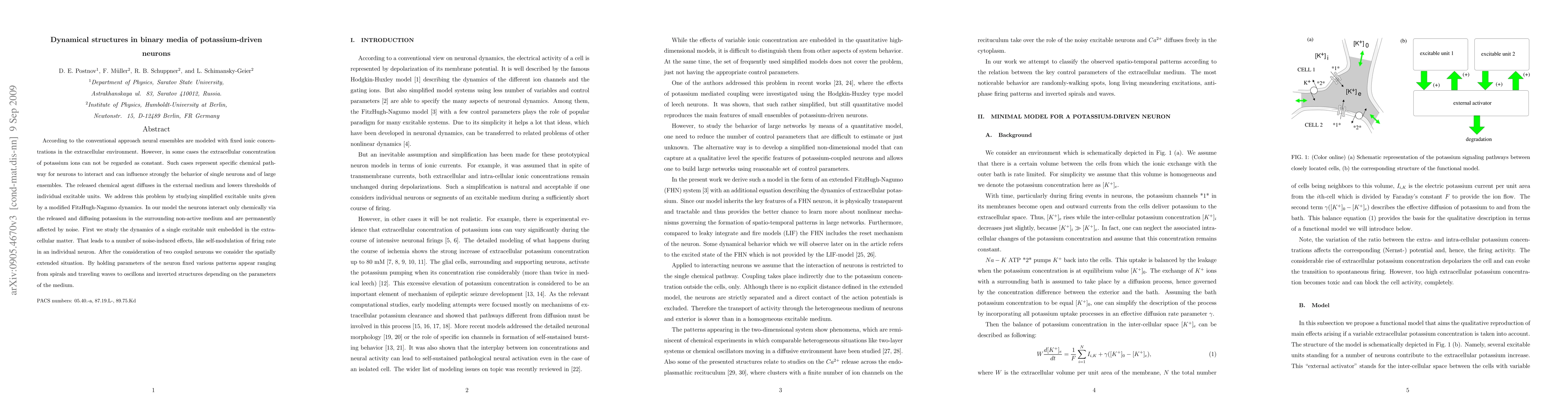 According to the conventional approach to model neural ensembles the extracellular environment has fixed ionic concentrations. However, in many cases the extracellular concentration of potassium ions can not be regarded as constant. That represents specific chemical pathway for neurons to interact and can influence strongly the behavior of a single neuron as well as large ensembles. The released chemical agent follows a diffusive dynamics in the external medium, that lowers the threshold of individual excitable units. We address this problem by studying simplified excitable units given by a modified FitzHugh-Nagumo dynamics. In our model neurons interact only chemically via the released and diffusing potassium in the surrounding non-active medium. We study the dynamics of a single excitable unit embedded in the extracellular matter. That leads to a number of noise-induced effects, like self-modulation of firing rate in an individual neuron. In the spatially extended situation various patterns appear ranging from spirals and traveling waves to oscillons and inverted structures depending on the parameters of the medium.