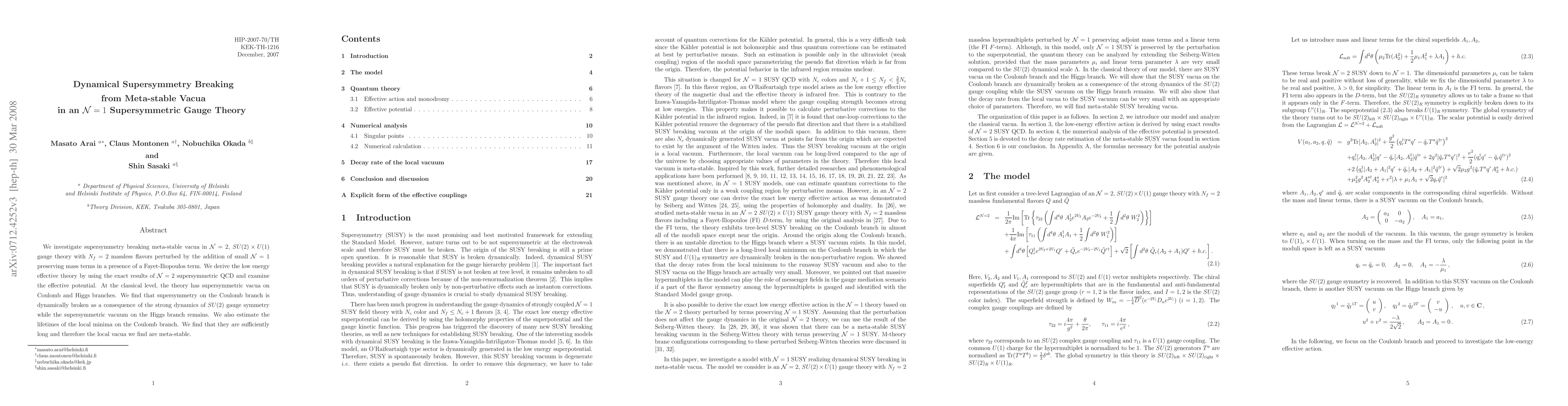 This research examines meta-stable vacua in N=2 supersymmetric gauge theory with SU(2)×U(1) and two massless flavors, perturbed by small N=1 preserving mass terms. It finds that dynamical supersymmetry breaking occurs on the Coulomb branch due to SU(2) gauge dynamics, while the Higgs branch maintains supersymmetry. The local vacua are meta-stable with long lifetimes.