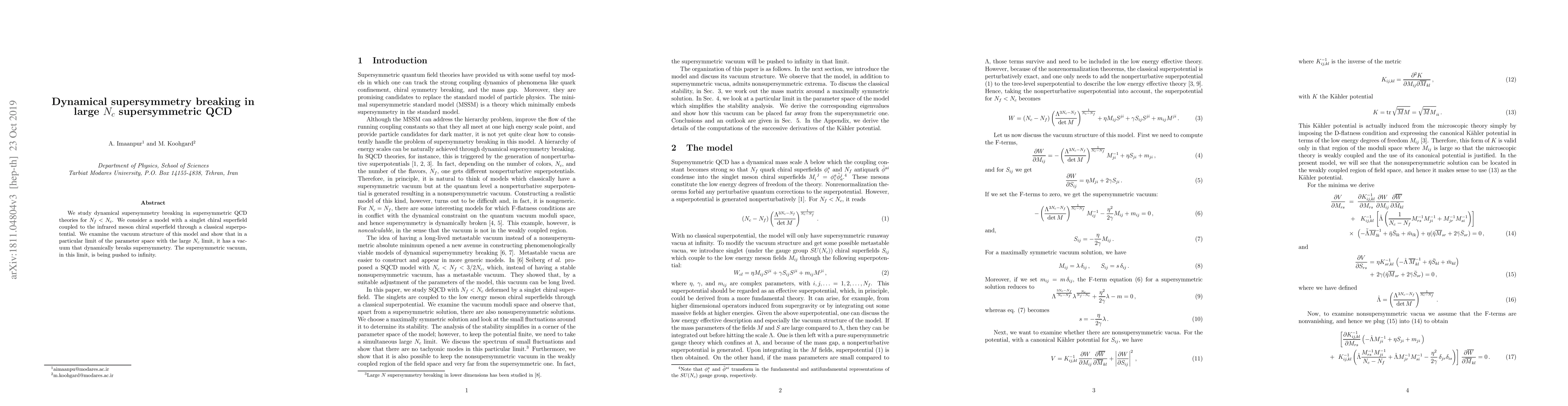 This paper investigates dynamical supersymmetry breaking in large $N_c$ supersymmetric QCD with $N_f<N_c$, focusing on a model with a singlet chiral superfield linked to an infrared meson chiral superfield. The study reveals that in a specific parameter limit, the vacuum dynamically breaks supersymmetry, pushing the supersymmetric vacuum to infinity.