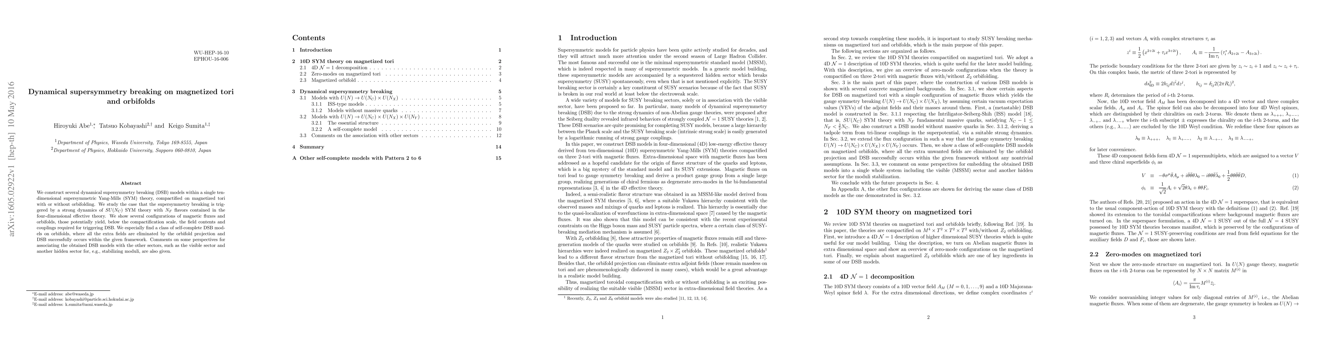 This paper constructs dynamical supersymmetry breaking models within a ten-dimensional supersymmetric Yang-Mills theory compactified on magnetized tori and orbifolds. It explores configurations of magnetic fluxes and orbifolds that trigger DSB in the four-dimensional effective theory, highlighting self-complete models on orbifolds where extra fields are eliminated, and discusses potential connections to visible and hidden sectors.