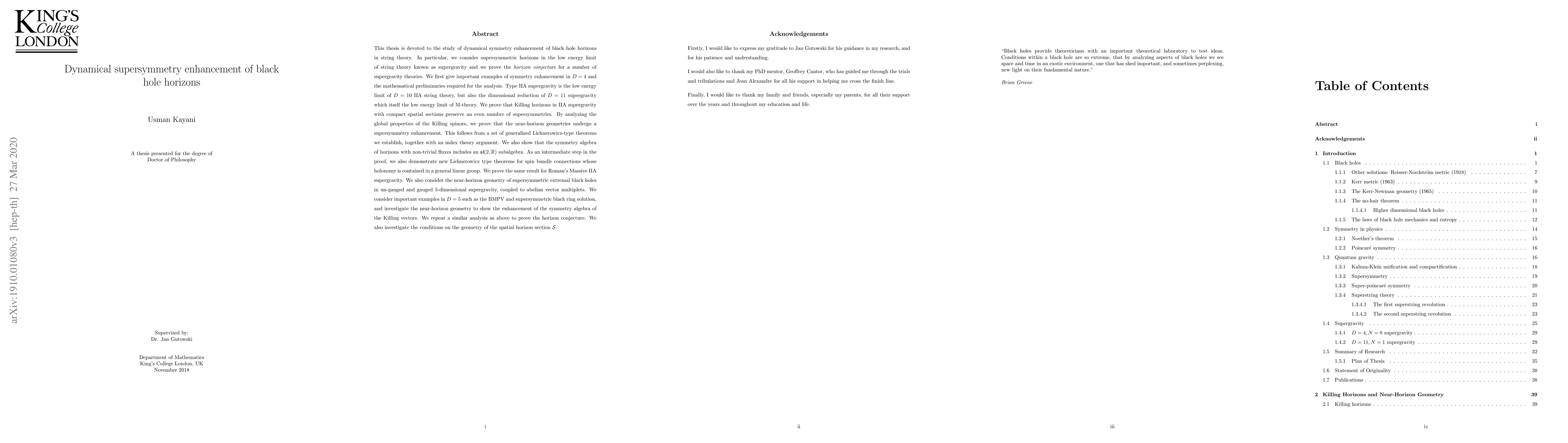 This paper investigates dynamical symmetry enhancement of black hole horizons in string theory, proving the horizon conjecture for various supergravity theories. It demonstrates supersymmetry enhancement in near-horizon geometries and establishes new Lichnerowicz-type theorems for spin bundle connections.