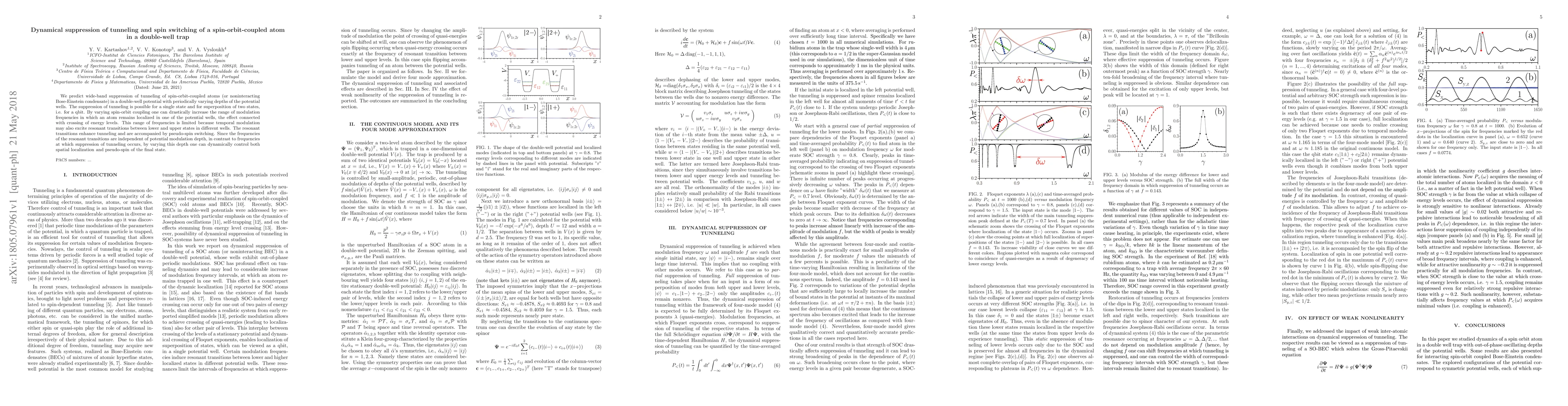 We predict wide-band suppression of tunneling of spin-orbit-coupled atoms (or noninteracting Bose-Einstein condensate) in a double-well potential with periodically varying depths of the potential wells. The suppression of tunneling is possible for a single state and for superposition of two states, i.e. for a qbit. By varying spin-orbit coupling one can drastically increase the range of modulation frequencies in which an atom remains localized in one of the potential wells, the effect connected with crossing of energy levels. This range of frequencies is limited because temporal modulation may also excite resonant transitions between lower and upper states in different wells. The resonant transitions enhance tunneling and are accompanied by pseudo-spin switching. Since the frequencies of the resonant transitions are independent of potential modulation depth, in contrast to frequencies at which suppression of tunneling occurs, by varying this depth one can dynamically control both spatial localization and pseudo-spin of the final state.
