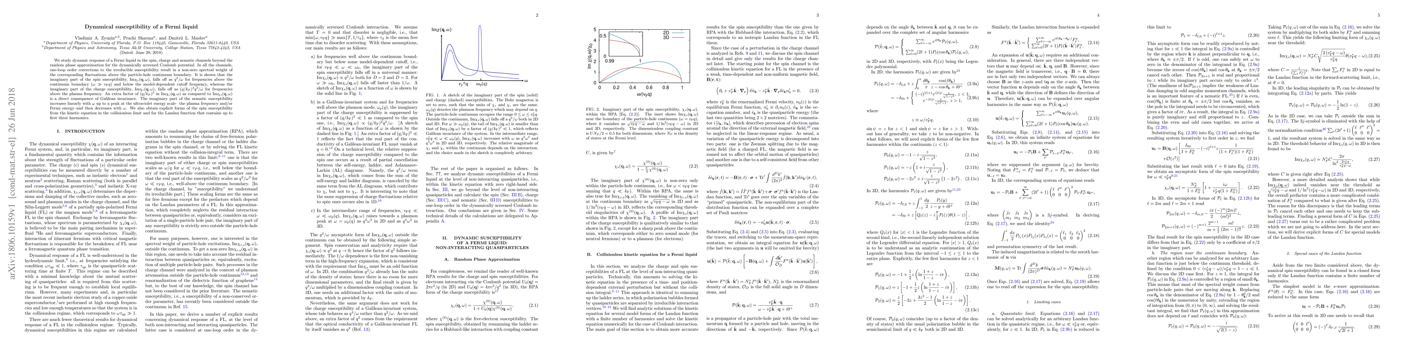 We study the dynamic response of a Fermi liquid in the spin, charge and nematic channels beyond the random phase approximation for the dynamically screened Coulomb potential. In all the channels, one-loop order corrections to the irreducible susceptibility result in a non-zero spectral weight of the corresponding fluctuations above the particle-hole continuum boundary. It is shown that the imaginary part of the spin susceptibility, $\text{Im}\chi_{s}(\bf{q},\omega)$, falls off as $q^2/\omega$ for frequencies above the continuum boundary ($\omega\gg v_{F} q$) and below the model-dependent cutoff frequency, whereas the imaginary part of the charge susceptibility, $\text{Im}\chi_c(\bf{q},\omega)$, falls off as $(q/k_F)^2 q^2/\omega$ for frequencies above the plasma frequency. An extra factor of $(q/k_F)^2$ in $\text{Im}\chi_c(\bf{q},\omega)$ as compared to $\text{Im}\chi_{s}(\bf{q},\omega)$ is a direct consequence of Galilean invariance. The imaginary part of the nematic susceptibility increases linearly with $\omega$ up to a peak at the ultraviolet energy scale-- the plasma frequency and/or Fermi energy--and then decreases with $\omega$. We also obtain explicit forms of the spin susceptibility from the kinetic equation in the collisionless limit and for the Landau function that contains up to first three harmonics.