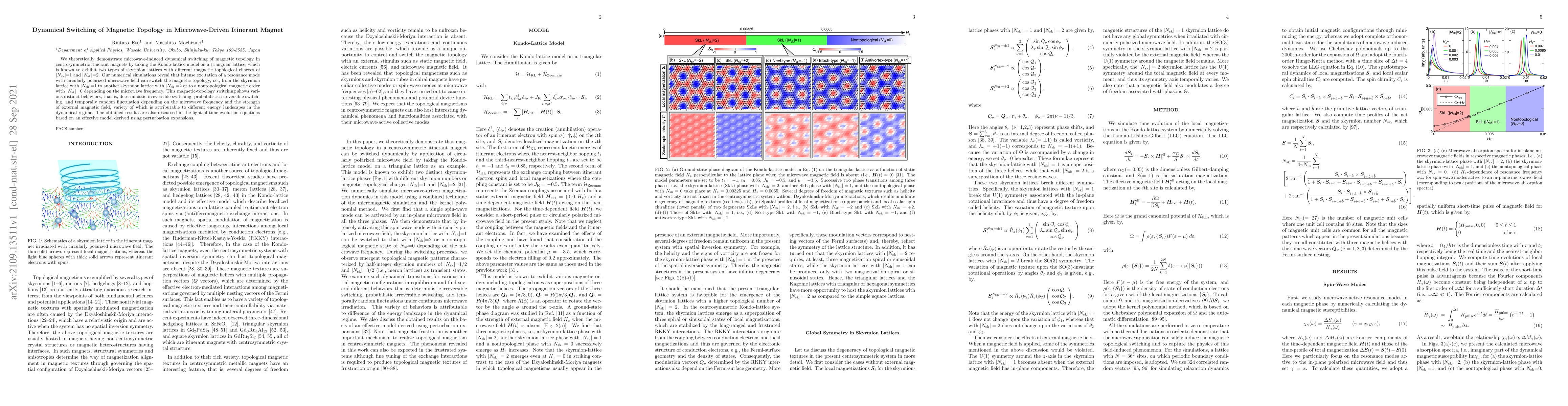 This paper demonstrates microwave-induced switching of magnetic topology in itinerant magnets using the Kondo-lattice model. Numerical simulations show that high-frequency microwaves can deterministically, probabilistically, or randomly alter skyrmion lattices' topological charges, depending on the frequency and external magnetic field, revealing diverse dynamical behaviors.
