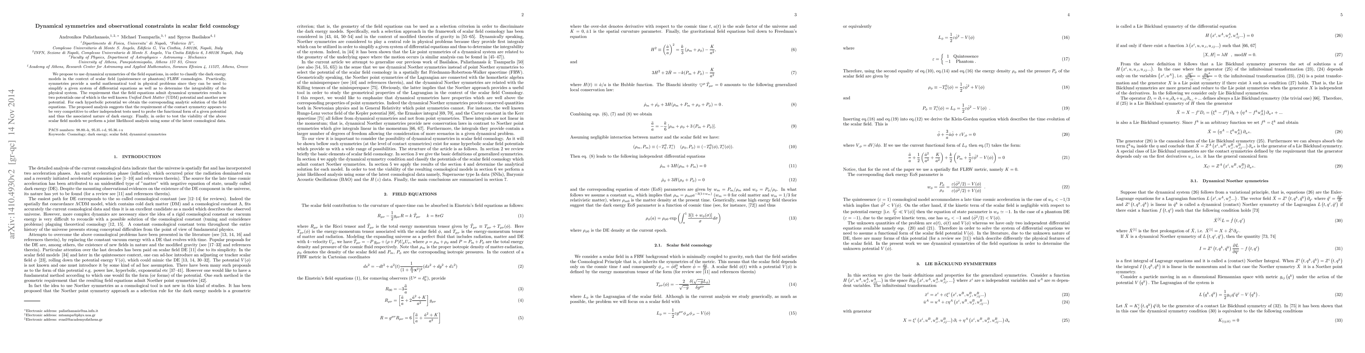 This paper uses dynamical symmetries to classify dark energy models in scalar field cosmology, proposing new potentials that simplify the analysis of these models. It suggests a competitive test for the functional form of dark energy models, including joint likelihood analysis with latest cosmological data.