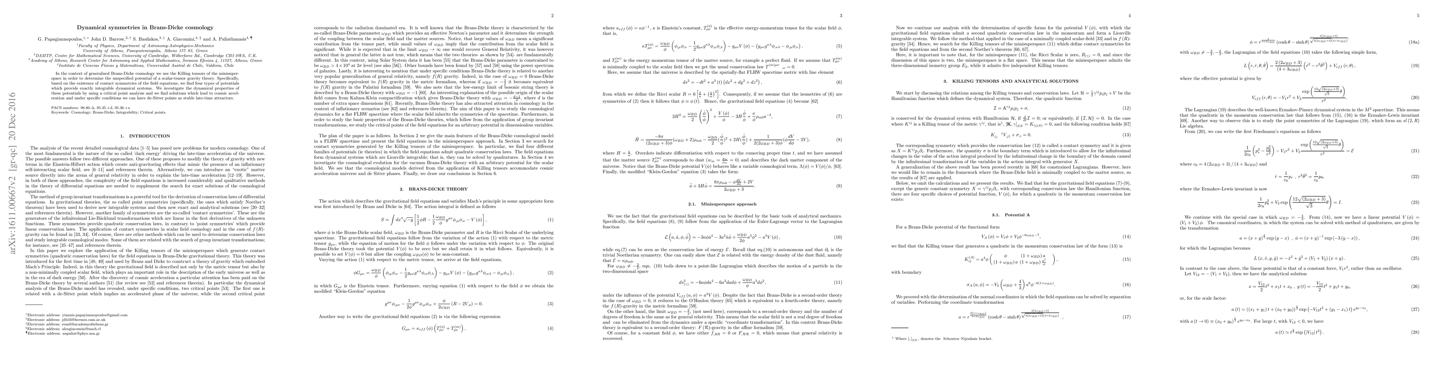 This paper explores dynamical symmetries in generalised Brans-Dicke cosmology, using Killing tensors to determine the potential of scalar-tensor gravity theories. It identifies four integrable potentials leading to cosmic acceleration and finds de-Sitter points as stable late-time attractors under specific conditions.