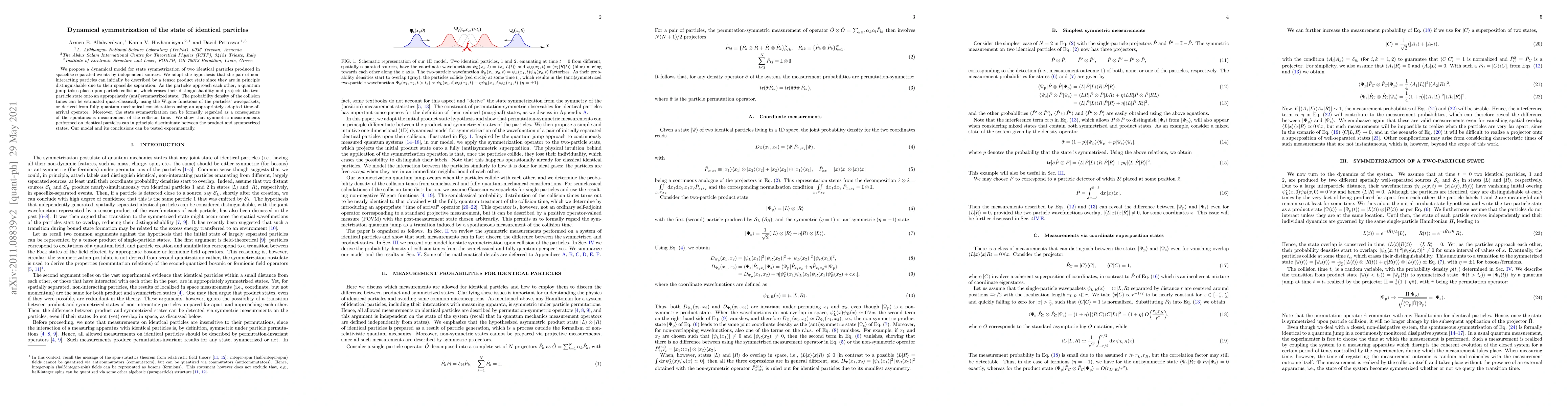 We propose a dynamical model for state symmetrization of two identical particles produced in spacelike-separated events by independent sources. We adopt the hypothesis that the pair of non-interacting particles can initially be described by a tensor product state since they are in principle distinguishable due to their spacelike separation. As the particles approach each other, a quantum jump takes place upon particle collision, which erases their distinguishability and projects the two-particle state onto an appropriately (anti)symmetrized state. The probability density of the collision times can be estimated quasi-classically using the Wigner functions of the particles' wavepackets, or derived from fully quantum mechanical considerations using an appropriately adapted time-of-arrival operator. Moreover, the state symmetrization can be formally regarded as a consequence of the spontaneous measurement of the collision time. We show that symmetric measurements performed on identical particles can in principle discriminate between the product and symmetrized states. Our model and its conclusions can be tested experimentally.