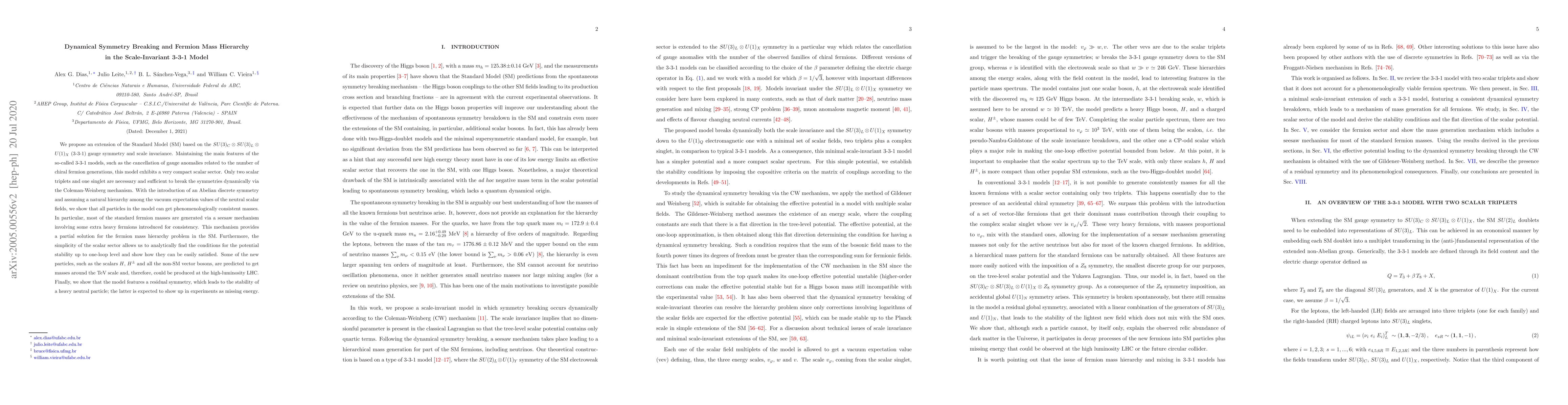 This paper proposes an extended Standard Model based on a 3-3-1 gauge symmetry with scale invariance, featuring a compact scalar sector that dynamically breaks symmetries and generates fermion masses via a seesaw mechanism. The model predicts new particles at the TeV scale and a stable heavy neutral particle, potentially observable as missing energy.