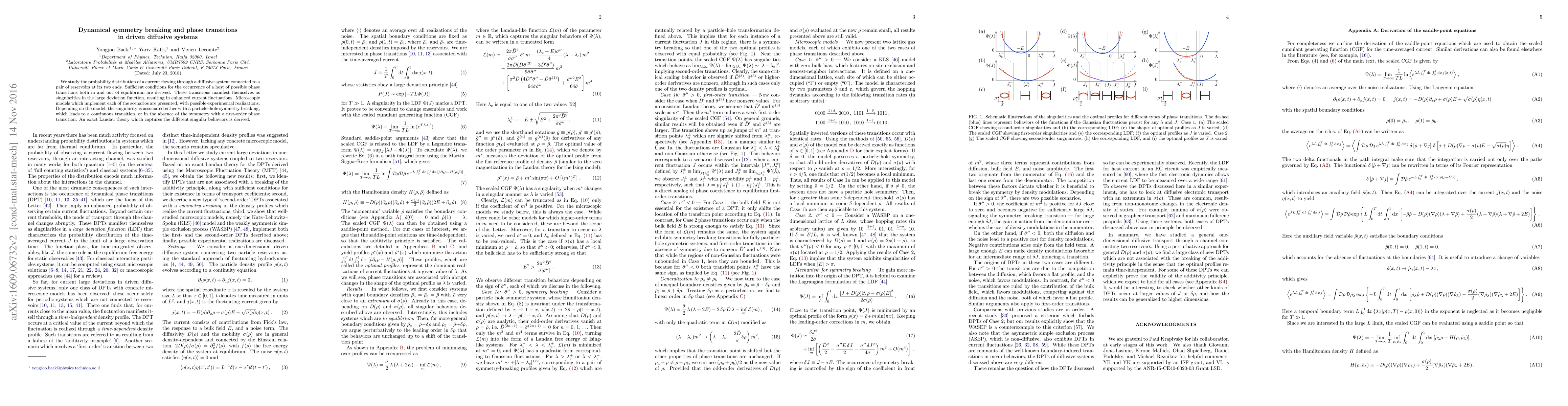This paper investigates phase transitions in driven diffusive systems, deriving conditions for both equilibrium and non-equilibrium transitions characterized by singularities in the large deviation function. It presents microscopic models and experimental realizations, highlighting symmetry breaking and its role in continuous and first-order phase transitions, and develops an exact Landau theory to describe these behaviors.