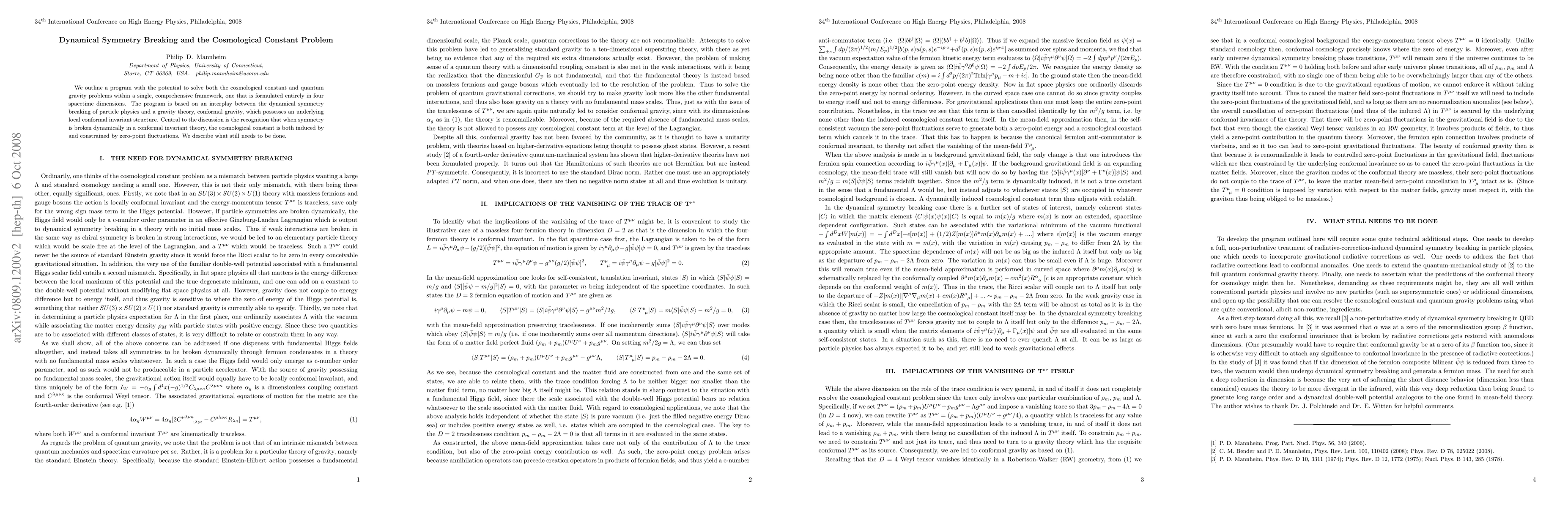 We outline a program with the potential to solve both the cosmological constant and quantum gravity problems within a single, comprehensive framework, one that is formulated entirely in four spacetime dimensions. The program is based on an interplay between the dynamical symmetry breaking of particle physics and a gravity theory, conformal gravity, which possesses an underlying local conformal invariant structure. Central to the discussion is the recognition that when symmetry is broken dynamically in a conformal invariant theory, the cosmological constant is both induced by and constrained by zero-point fluctuations. We describe what still needs to be done.
