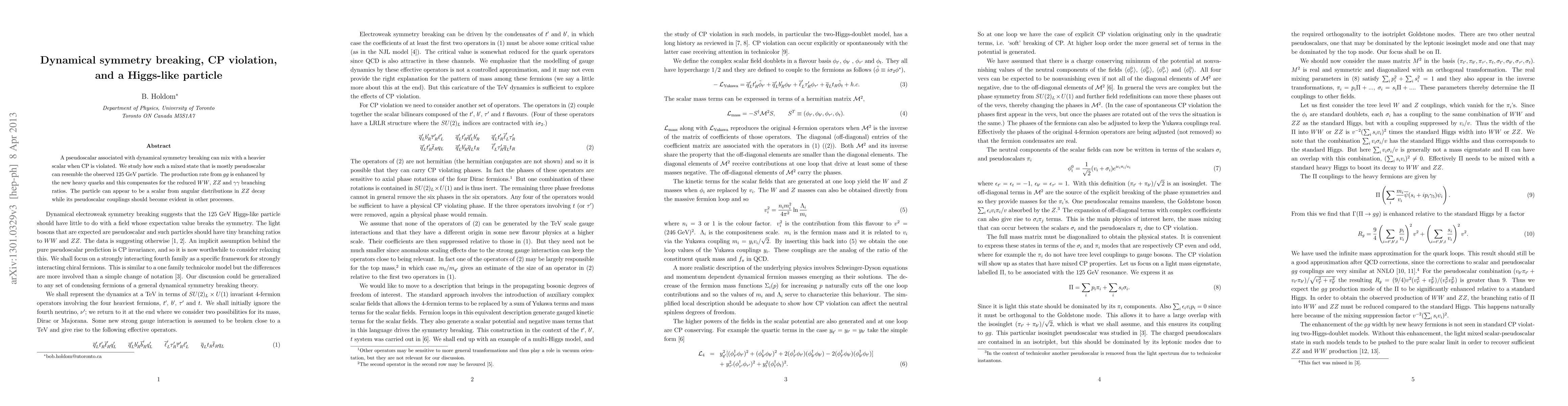 A pseudoscalar associated with dynamical symmetry breaking can mix with a heavier scalar when CP is violated. We study how such a mixed state that is mostly pseudoscalar can resemble the observed 125 GeV particle. The production rate from $gg$ is enhanced by the new heavy quarks and this compensates for the reduced $WW$, $ZZ$ and $\gamma\gamma$ branching ratios. The particle can appear to be a scalar from angular distributions in $ZZ$ decay while its pseudoscalar couplings should become evident in other processes.
