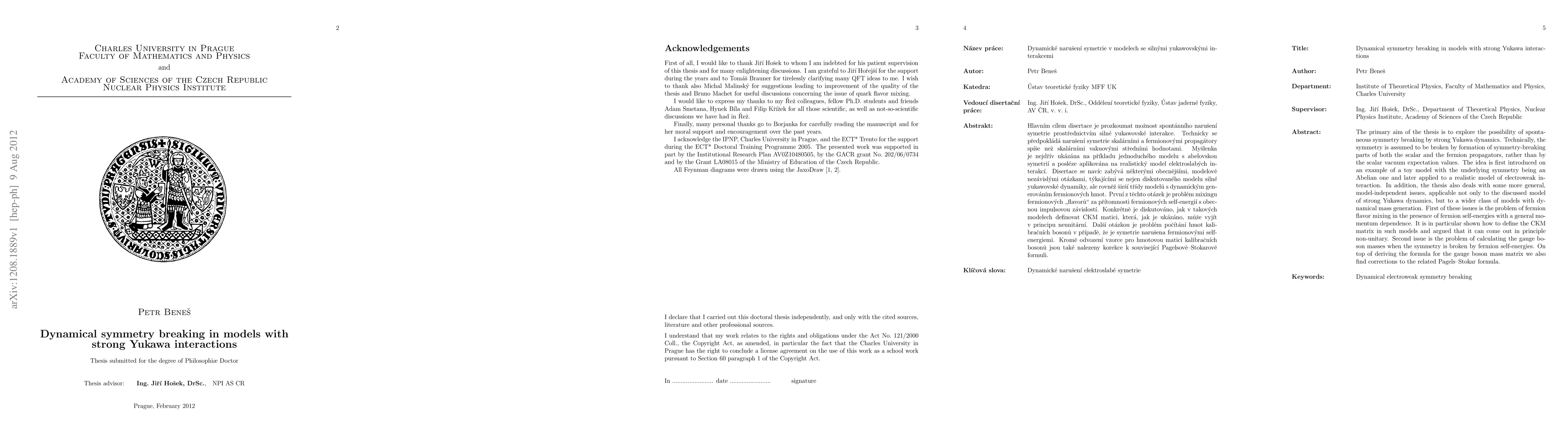 The primary aim of the thesis is to explore the possibility of spontaneous symmetry breaking by strong Yukawa dynamics. Technically, the symmetry is assumed to be broken by formation of symmetry-breaking parts of both the scalar and the fermion propagators, rather than by the scalar vacuum expectation values. The idea is first introduced on an example of a toy model with the underlying symmetry being an Abelian one and later applied to a realistic model of electroweak interaction. In addition, the thesis also deals with some more general, model-independent issues, applicable not only to the discussed model of strong Yukawa dynamics, but to a wider class of models with dynamical mass generation. First of these issues is the problem of fermion flavor mixing in the presence of fermion self-energies with a general momentum dependence. It is in particular shown how to define the Cabibbo-Kobayashi-Maskawa (CKM) matrix in such models and argued that it can come out in principle non-unitary. Second issue is the problem of calculating the gauge boson masses when the symmetry is broken by fermion self-energies. On top of deriving the formula for the gauge boson mass matrix we also find corrections to the related Pagels-Stokar formula.
