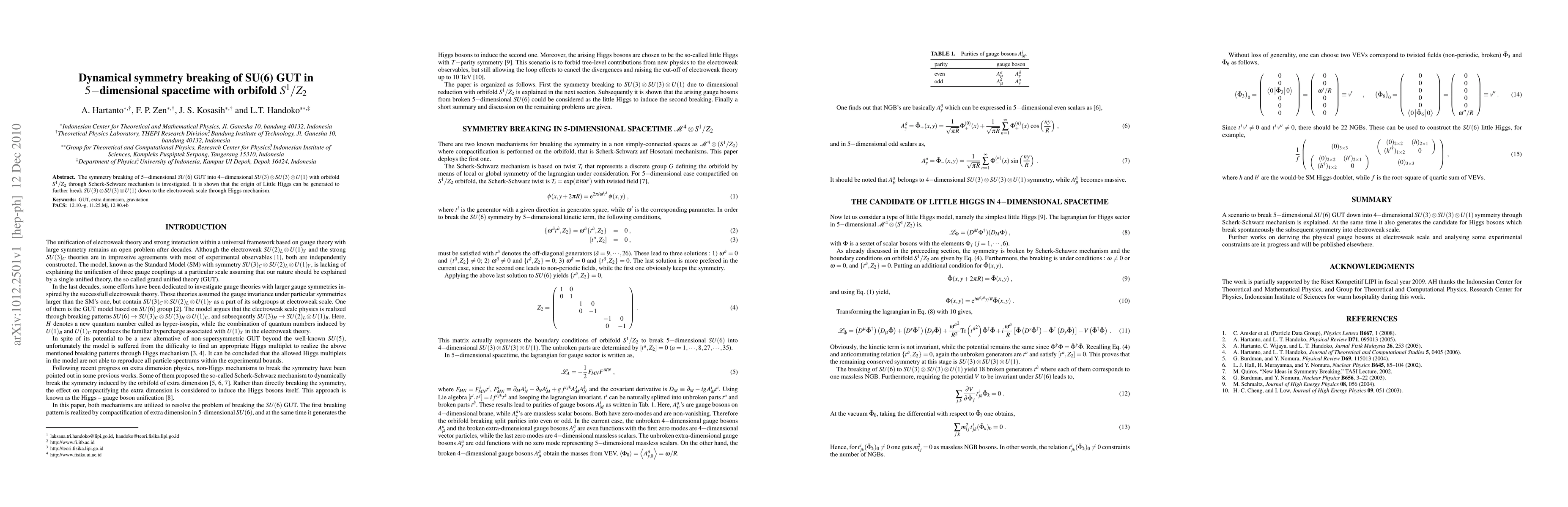 This paper investigates the dynamical symmetry breaking of a 5D SU(6) GUT model down to 4D SU(3) x SU(3) x U(1) via the Scherk-Schwarz mechanism on an orbifold S1/Z2, generating a Little Higgs to further break the symmetry down to the electroweak scale.