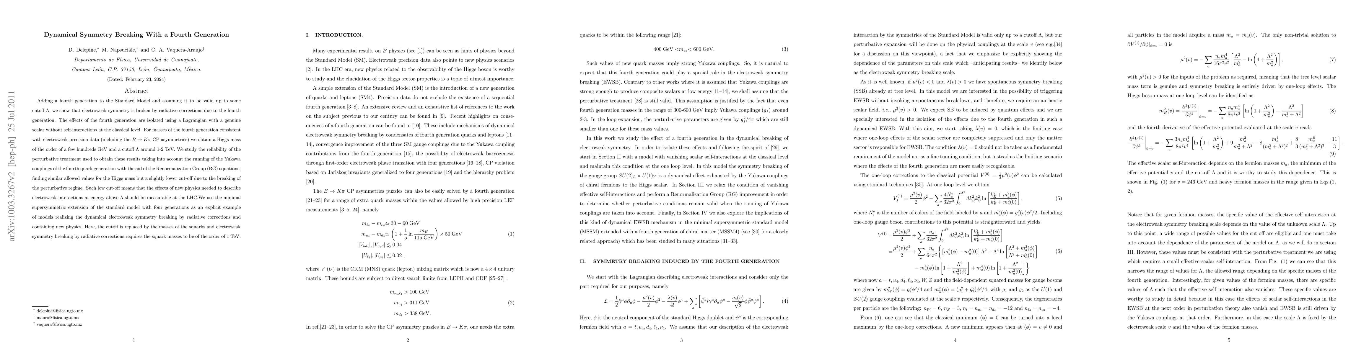 Adding a fourth generation to the Standard Model and assuming it to be valid up to some cutoff \Lambda, we show that electroweak symmetry is broken by radiative corrections due to the fourth generation. The effects of the fourth generation are isolated using a Lagrangian with a genuine scalar without self-interactions at the classical level. For masses of the fourth generation consistent with electroweak precision data (including the B \rightarrow K \pi\ CP asymmetries) we obtain a Higgs mass of the order of a few hundreds GeV and a cutoff \Lambda\ around 1-2 TeV. We study the reliability of the perturbative treatment used to obtain these results taking into account the running of the Yukawa couplings of the fourth quark generation with the aid of the Renormalization Group (RG) equations, finding similar allowed values for the Higgs mass but a slightly lower cut-off due to the breaking of the perturbative regime. Such low cut-off means that the effects of new physics needed to describe electroweak interactions at energy above \Lambda\ should be measurable at the LHC. We use the minimal supersymmetric extension of the standard model with four generations as an explicit example of models realizing the dynamical electroweak symmetry breaking by radiative corrections and containing new physics. Here, the cutoff is replaced by the masses of the squarks and electroweak symmetry breaking by radiative corrections requires the squark masses to be of the order of 1 TeV.