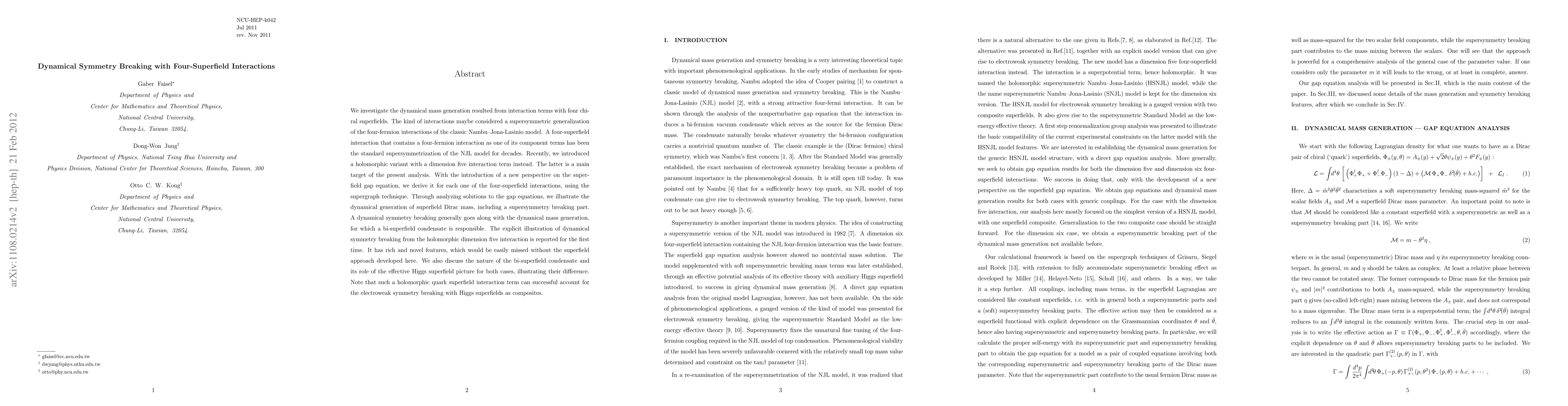 This paper explores the dynamical symmetry breaking and mass generation through four-superfield interactions, specifically focusing on a holomorphic dimension five term. It introduces a novel superfield gap equation and demonstrates the emergence of a supersymmetry breaking part, providing a first illustration of dynamical symmetry breaking from this interaction.