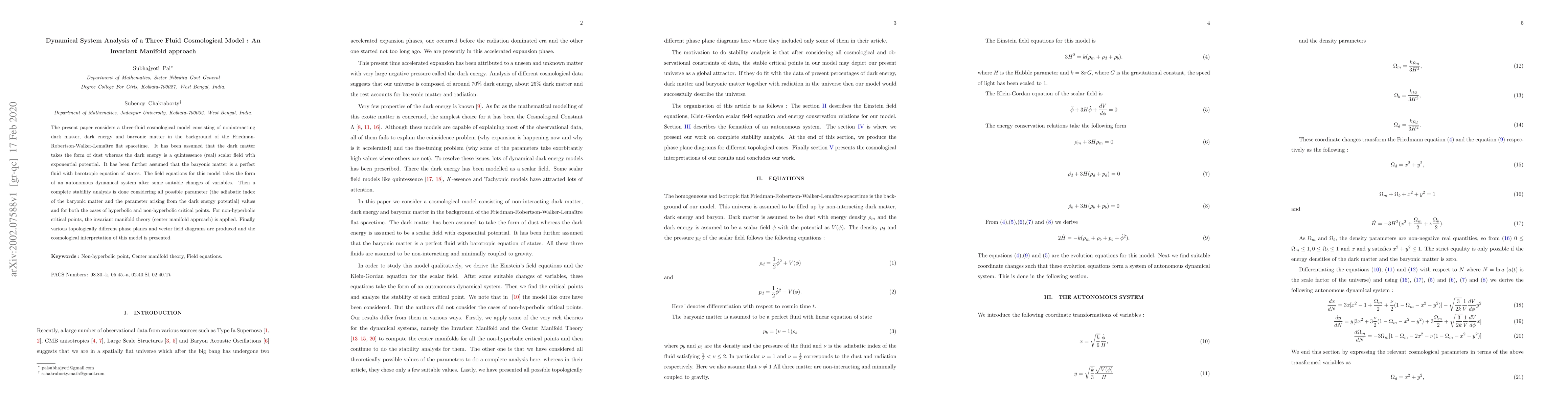 The present paper considers a three-fluid cosmological model consisting of noninteracting dark matter, dark energy and baryonic matter in the background of the Friedmann- Robertson- Walker- Lemaitre flat spacetime. It has been assumed that the dark matter takes the form of dust whereas the dark energy is a quintessence (real) scalar field with exponential potential. It has been further assumed that the baryonic matter is a perfect fluid with barotropic equation of states. The field equations for this model takes the form of an autonomous dynamical system after some suitable changes of variables. Then a complete stability analysis is done considering all possible parameter (the adiabatic index of the baryonic matter and the parameter arising from the dark energy potential) values and for both the cases of hyperbolic and non-hyperbolic critical points. For non-hyperbolic critical points, the invariant manifold theory (center manifold approach) is applied. Finally various topologically different phase planes and vector field diagrams are produced and the cosmological interpretation of this model is presented.