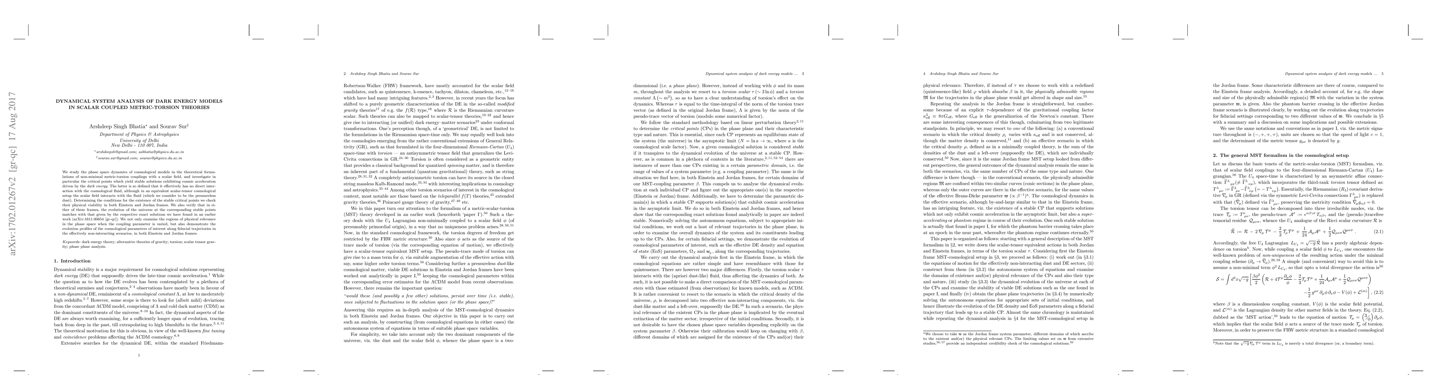 We study the phase space dynamics of cosmological models in the theoretical formulations of non-minimal metric-torsion couplings with a scalar field, and investigate in particular the critical points which yield stable solutions exhibiting cosmic acceleration driven by the {\em dark energy}. The latter is defined in a way that it effectively has no direct interaction with the cosmological fluid, although in an equivalent scalar-tensor cosmological setup the scalar field interacts with the fluid (which we consider to be the pressureless dust). Determining the conditions for the existence of the stable critical points we check their physical viability, in both Einstein and Jordan frames. We also verify that in either of these frames, the evolution of the universe at the corresponding stable points matches with that given by the respective exact solutions we have found in an earlier work (arXiv: 1611.00654 [gr-qc]). We not only examine the regions of physical relevance for the trajectories in the phase space when the coupling parameter is varied, but also demonstrate the evolution profiles of the cosmological parameters of interest along fiducial trajectories in the effectively non-interacting scenarios, in both Einstein and Jordan frames.