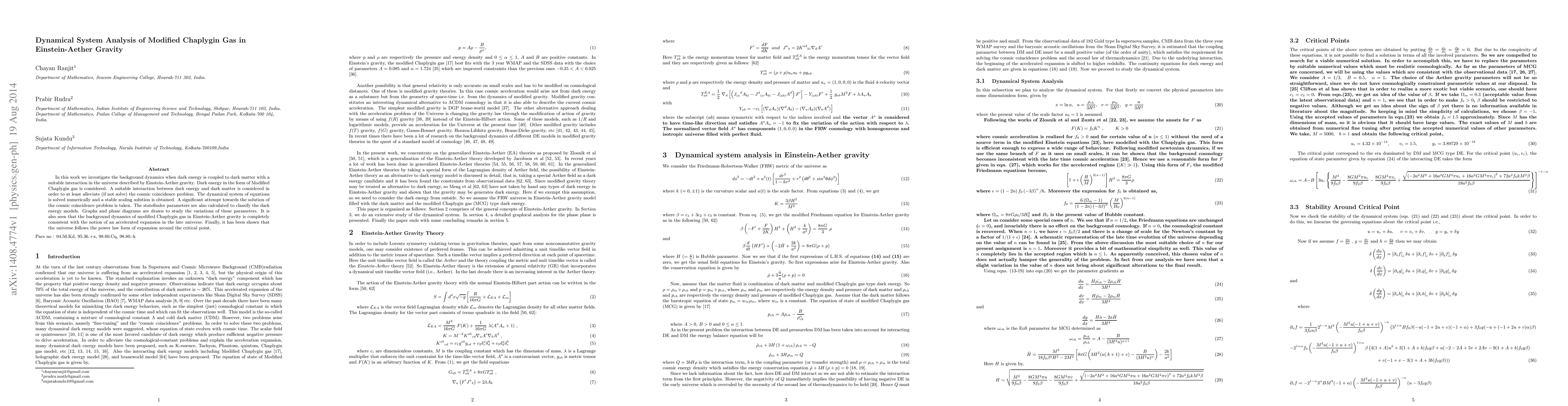 This paper analyzes the dynamics of Modified Chaplygin gas in the context of Einstein-Aether gravity, focusing on interactions between dark energy and dark matter to address the cosmic coincidence problem. Numerical solutions reveal a stable scaling solution and consistent accelerated expansion in the late universe, with statefinder parameters aiding in the classification of dark energy models.