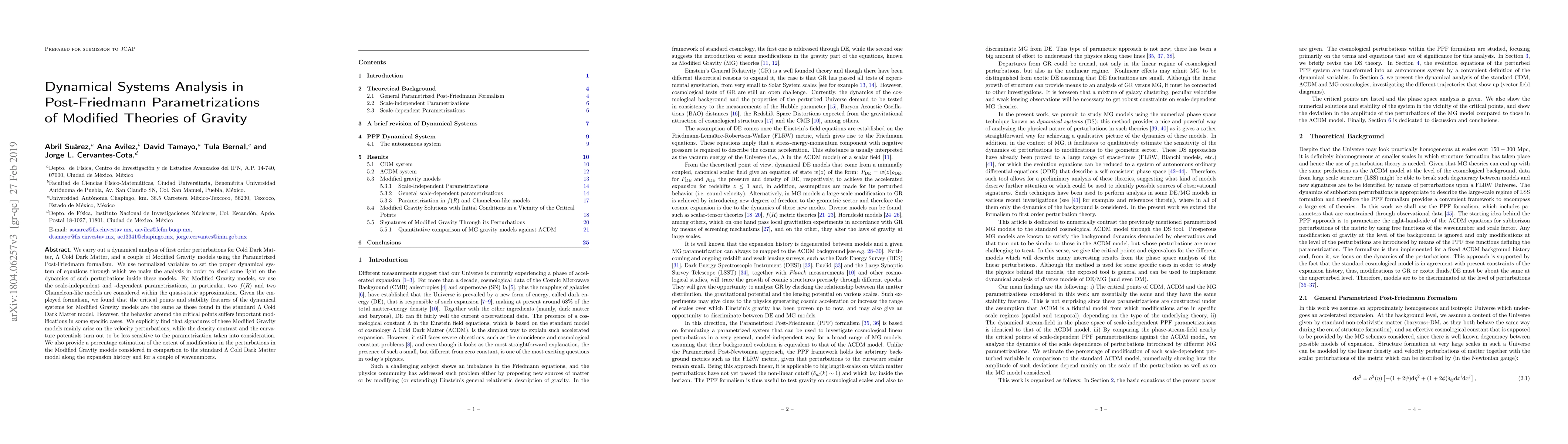 This paper analyzes first-order perturbations in Cold Dark Matter and $\Lambda$ Cold Dark Matter models using the Parametrized Post-Friedmann formalism, comparing them with several Modified Gravity models. It finds that while critical points and stability features are similar, Modified Gravity models show distinct behavior mainly in velocity perturbations.
