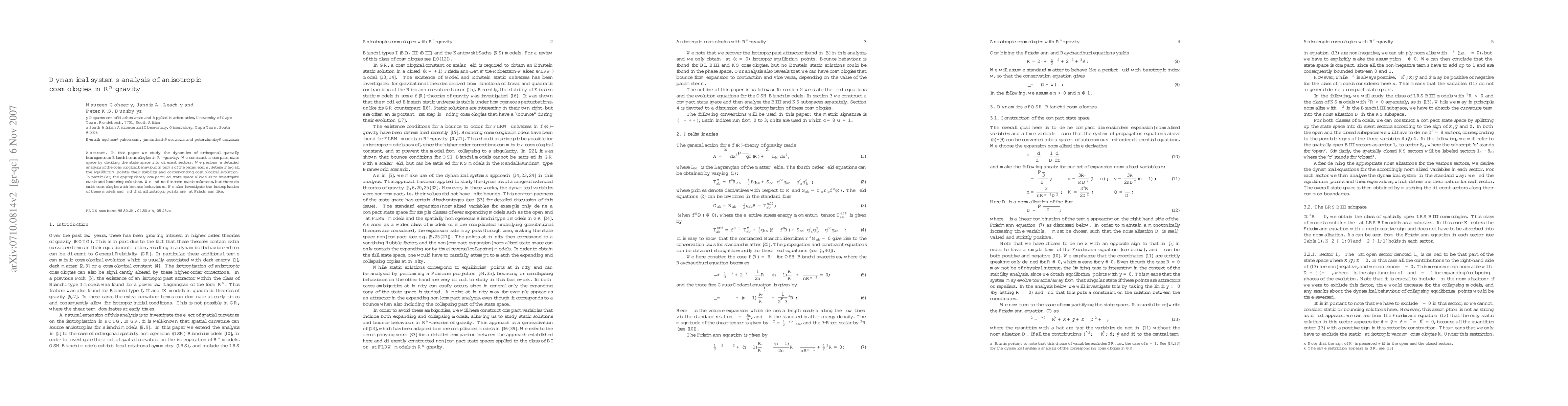 Researchers studied anisotropic cosmologies in $R^n$-gravity, finding that some models exhibit bounce behaviors but none show Einstein static solutions. They also found that all isotropic points result in flat Friedmann-like universes.