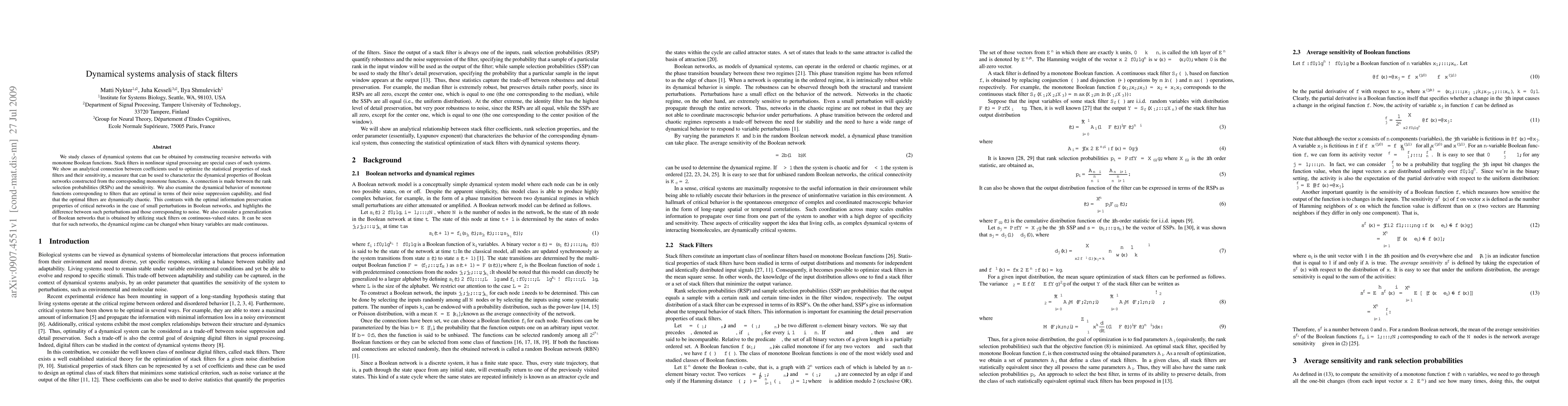 We study classes of dynamical systems that can be obtained by constructing recursive networks with monotone Boolean functions. Stack filters in nonlinear signal processing are special cases of such systems. We show an analytical connection between coefficients used to optimize the statistical properties of stack filters and their sensitivity, a measure that can be used to characterize the dynamical properties of Boolean networks constructed from the corresponding monotone functions. A connection is made between the rank selection probabilities (RSPs) and the sensitivity. We also examine the dynamical behavior of monotone functions corresponding to filters that are optimal in terms of their noise suppression capability, and find that the optimal filters are dynamically chaotic. This contrasts with the optimal information preservation properties of critical networks in the case of small perturbations in Boolean networks, and highlights the difference between such perturbations and those corresponding to noise. We also consider a generalization of Boolean networks that is obtained by utilizing stack filters on continuous-valued states. It can be seen that for such networks, the dynamical regime can be changed when binary variables are made continuous.