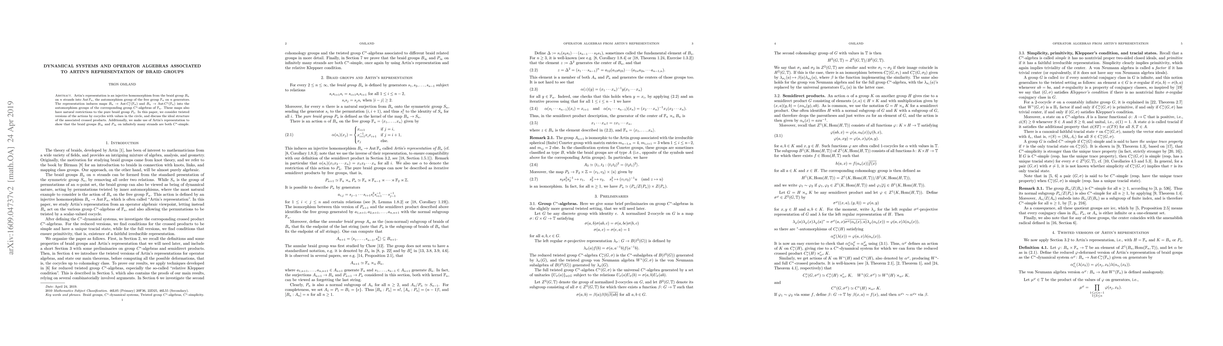 This paper explores dynamical systems and operator algebras connected to Artin's representation of braid groups, focusing on twisted actions and the ideal structure of associated crossed products. It also demonstrates that braid groups with infinitely many strands are $C^*$-simple.