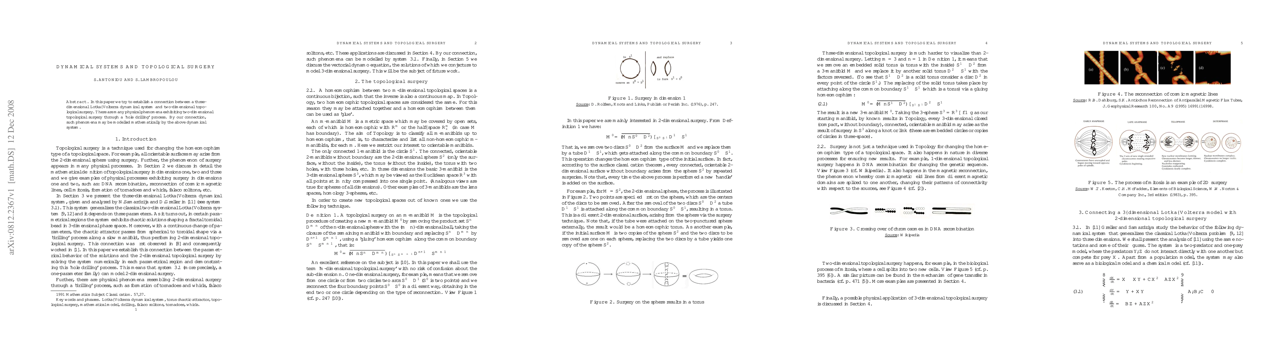 In this paper we try to establish a connection between a three-dimensional Lotka--Volterra dynamical system and two-dimensional topological surgery. There are many physical phenomena exhibiting two-dimensional topological surgery through a `hole drilling' process. By our connection, such phenomena may be modelled mathematically by the above dynamical system.