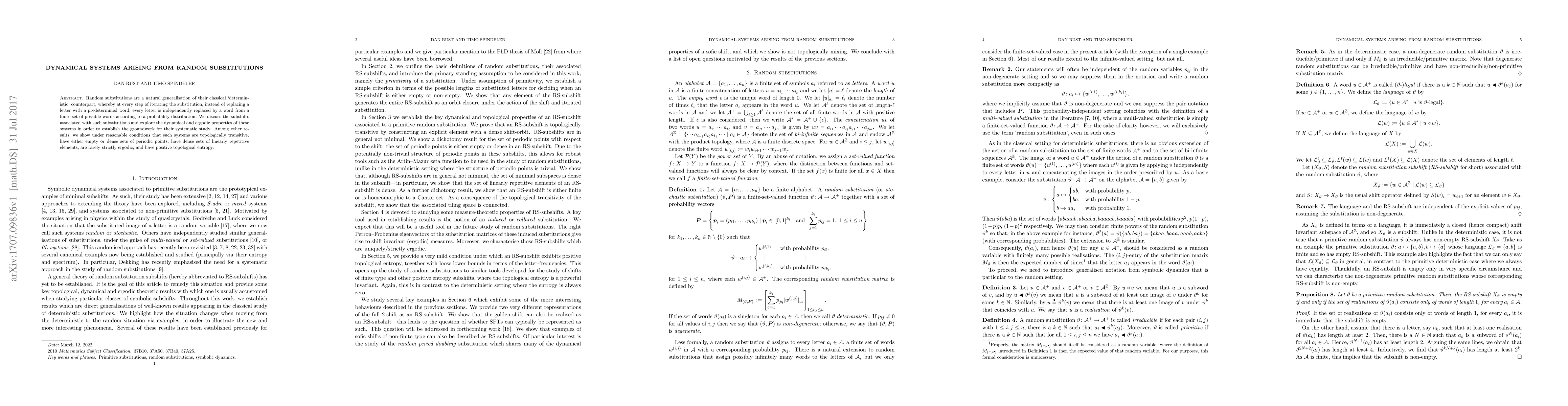 Random substitutions generalize deterministic ones by independently replacing letters with words from a finite set according to a probability distribution. The paper examines the dynamical and ergodic properties of the resulting subshifts, finding topological transitivity, dense periodic points, and positive topological entropy under reasonable conditions.