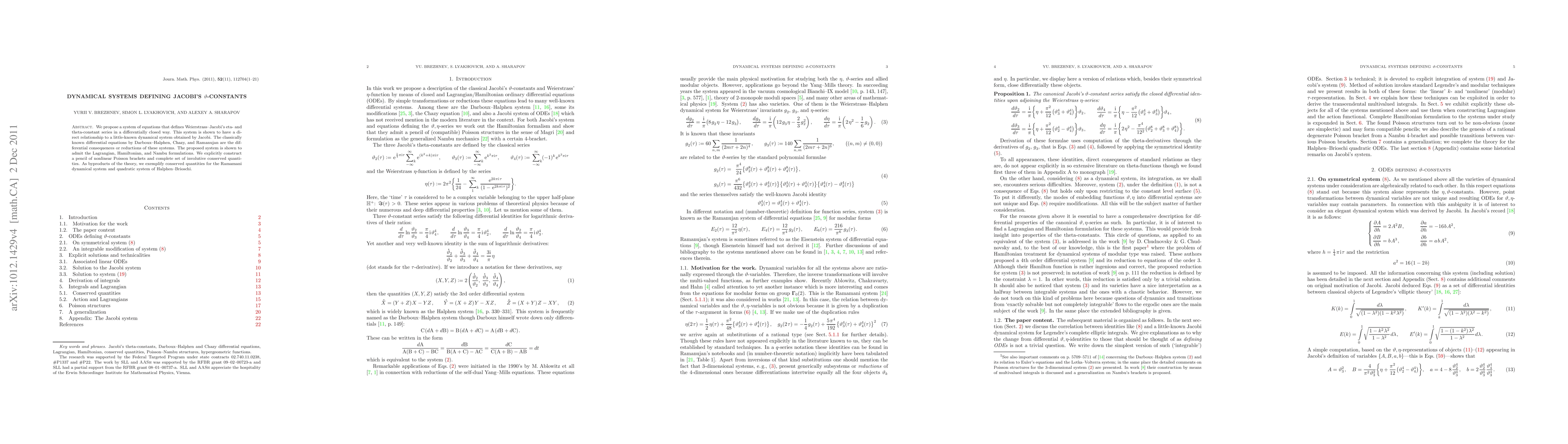 We propose a system of equations that defines Weierstrass--Jacobi's eta- and theta-constant series in a differentially closed way. This system is shown to have a direct relationship to a little-known dynamical system obtained by Jacobi. The classically known differential equations by Darboux--Halphen, Chazy, and Ramanujan are the differential consequences or reductions of these systems. The proposed system is shown to admit the Lagrangian, Hamiltonian, and Nambu formulations. We explicitly construct a pencil of nonlinear Poisson brackets and complete set of involutive conserved quantities. As byproducts of the theory, we exemplify conserved quantities for the Ramamani dynamical system and quadratic system of Halphen--Brioschi.