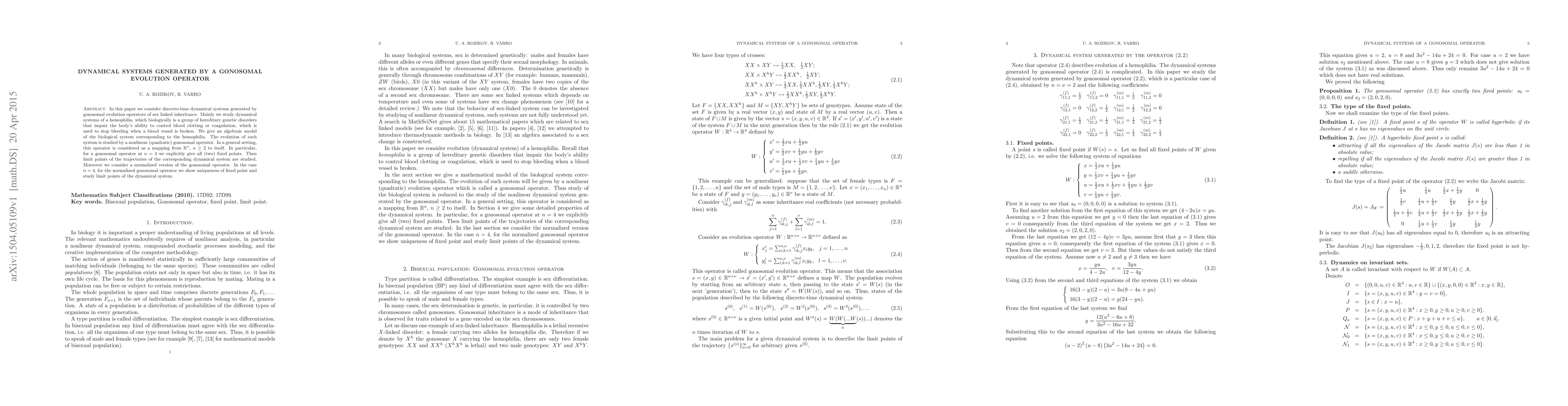 This paper explores discrete-time dynamical systems driven by gonosomal evolution operators related to sex-linked inheritance, focusing on hemophilia. It presents an algebraic model for the hereditary disorder and analyzes the system's evolution using a nonlinear gonosomal operator, identifying fixed points and studying limit points for both general and normalized cases.