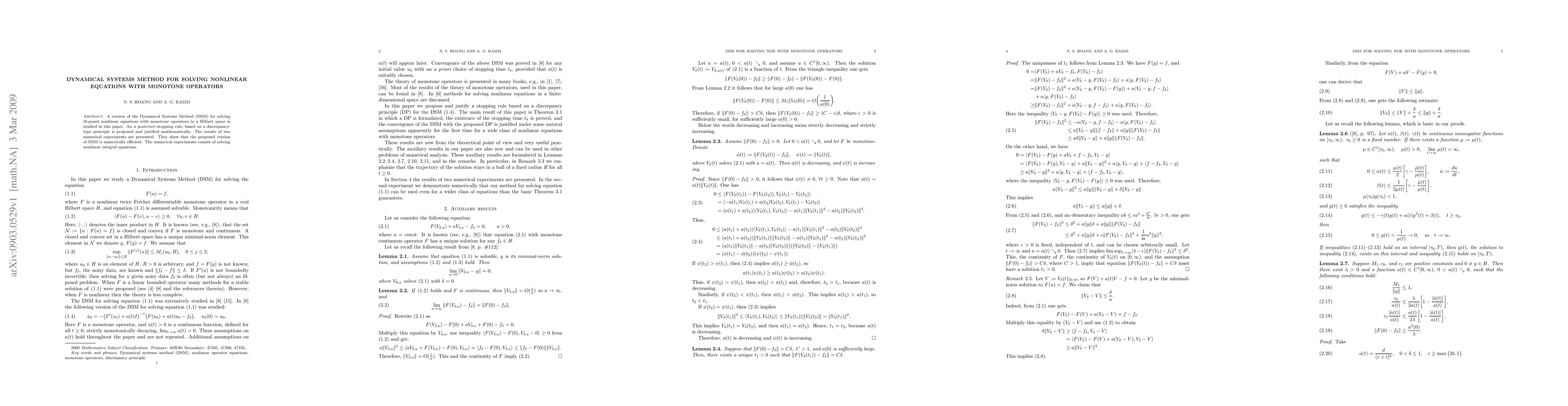 This paper explores the Dynamical Systems Method (DSM) for solving ill-posed nonlinear equations with monotone operators in Hilbert spaces. It proposes an a posteriori stopping rule based on a discrepancy-type principle, demonstrating numerical efficiency through experiments on nonlinear integral equations.