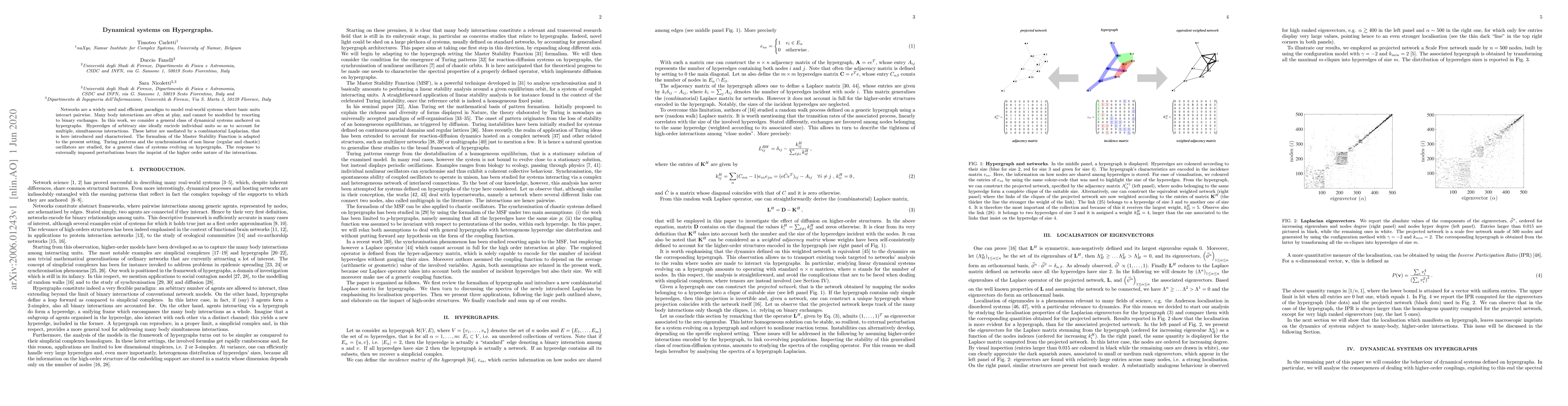 This paper explores dynamical systems on hypergraphs to model complex interactions beyond pairwise exchanges, introducing a combinatorial Laplacian and adapting the Master Stability Function. It investigates Turing patterns and synchronization of nonlinear oscillators on hypergraphs, highlighting the impact of higher-order interactions on system responses to perturbations.