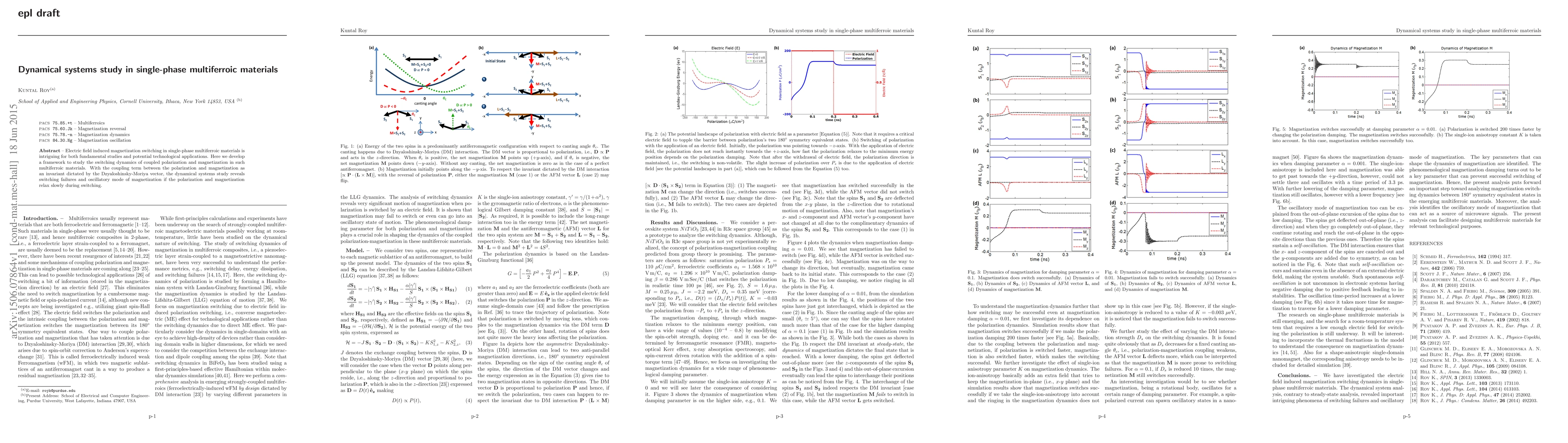 Electric field induced magnetization switching in single-phase multiferroic materials is intriguing for both fundamental studies and potential technological applications. Here we develop a framework to study the switching dynamics of coupled polarization and magnetization in such multiferroic materials. With the coupling term between the polarization and magnetization as an invariant dictated by the Dzyaloshinsky-Moriya vector, the dynamical systems study reveals switching failures and oscillatory mode of magnetization if the polarization and magnetization relax slowly during switching.